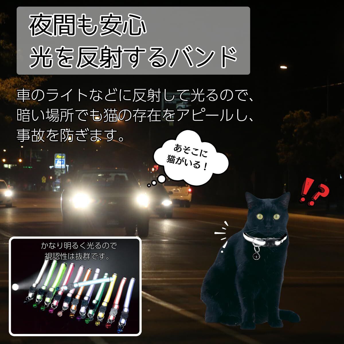 【夜間リフレクター付き】 夜間や暗い場所でも猫ちゃんが安全に過ごせるように、反射性の素材が採用されています。車のライトなどに反射することで、猫の存在をアピールし、事故を防ぎます。夜の散歩や外出時でも安心して利用できる首輪です。