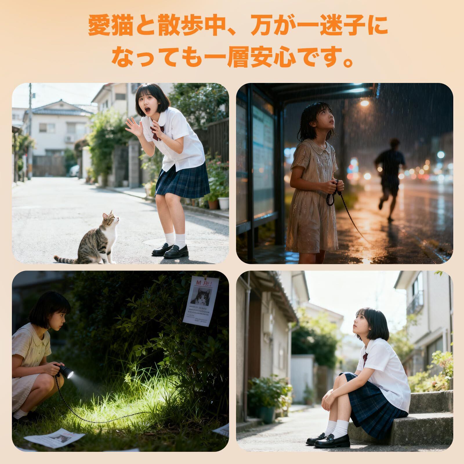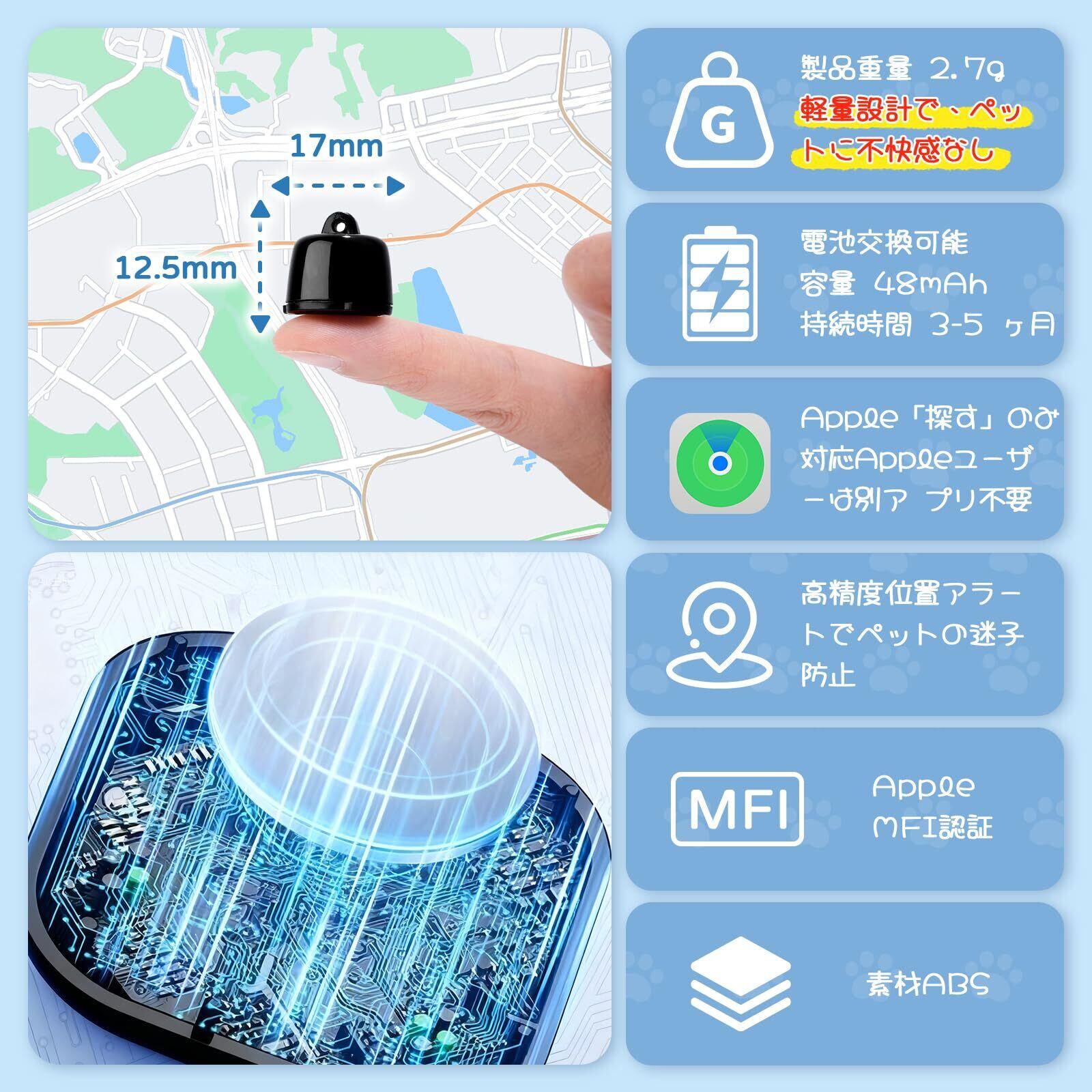 【本製品の主な留意点として、续航時間が短いことが挙げられます】 1:本製品は、ペットへの余計な負担や不快感を避けるため、サイズの極小化を追求しています。製品の续航時間に関心が高い場合、ご購入前にご確認いただき、慎重にご判断いただくようお願いいたします。 2:本製品はAirTag同様、周囲のAppleデバイスを利用して位置を特定します。近くにAppleデバイスがない場合、リアルタイムでの位置表示はできません。