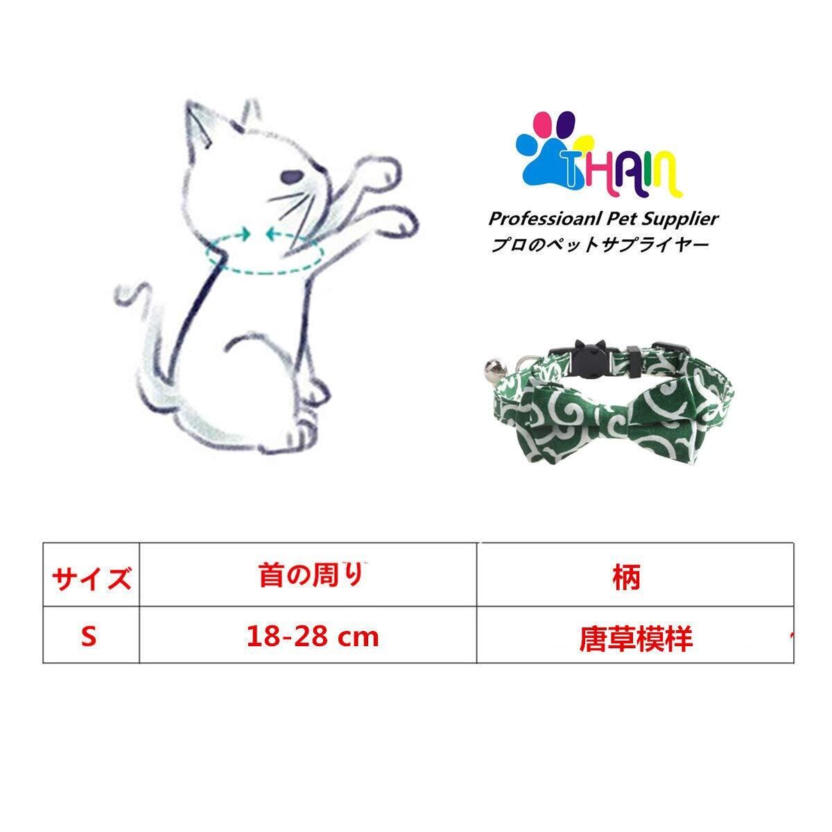 THAIN 猫首輪 唐草 セーフティバックル付 すず リボン かわいい 迷子ふだ ネームタグ 安全 ペット首輪(1本入り グリーン)