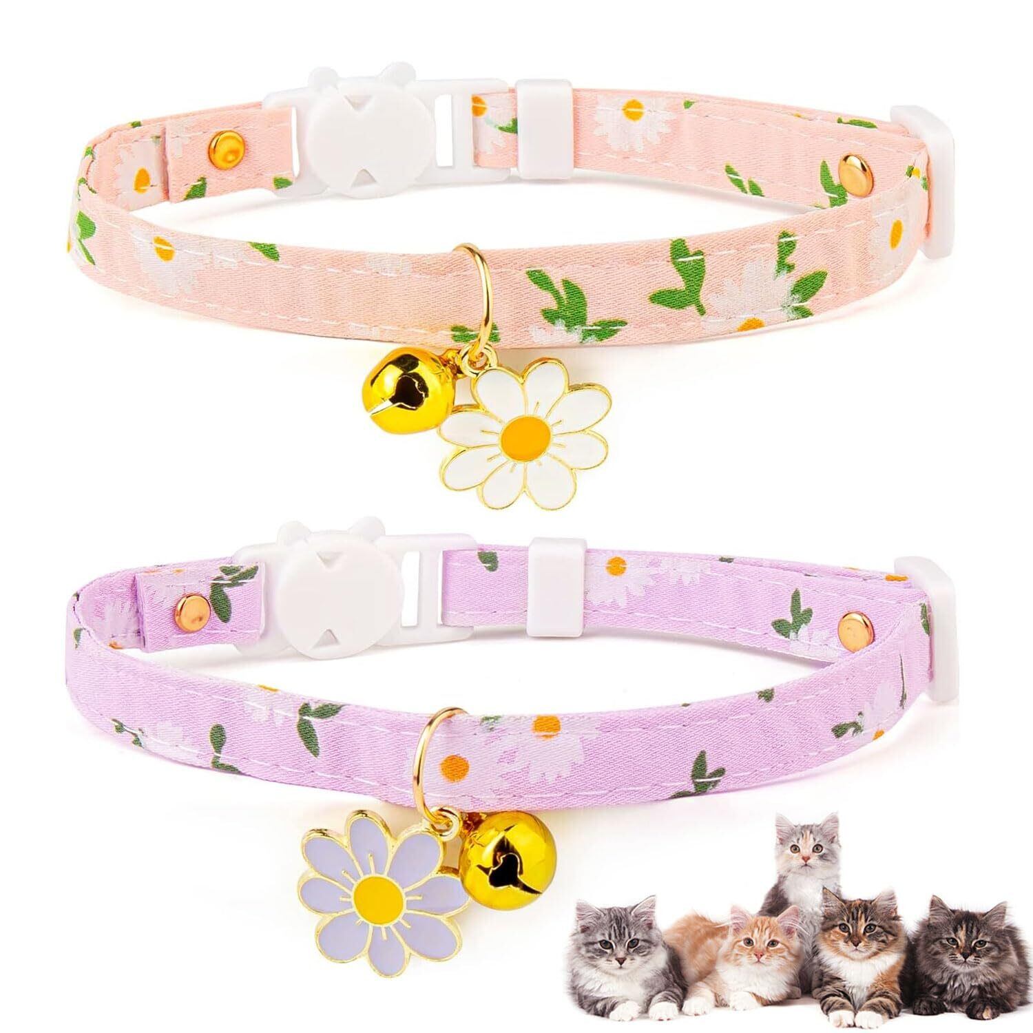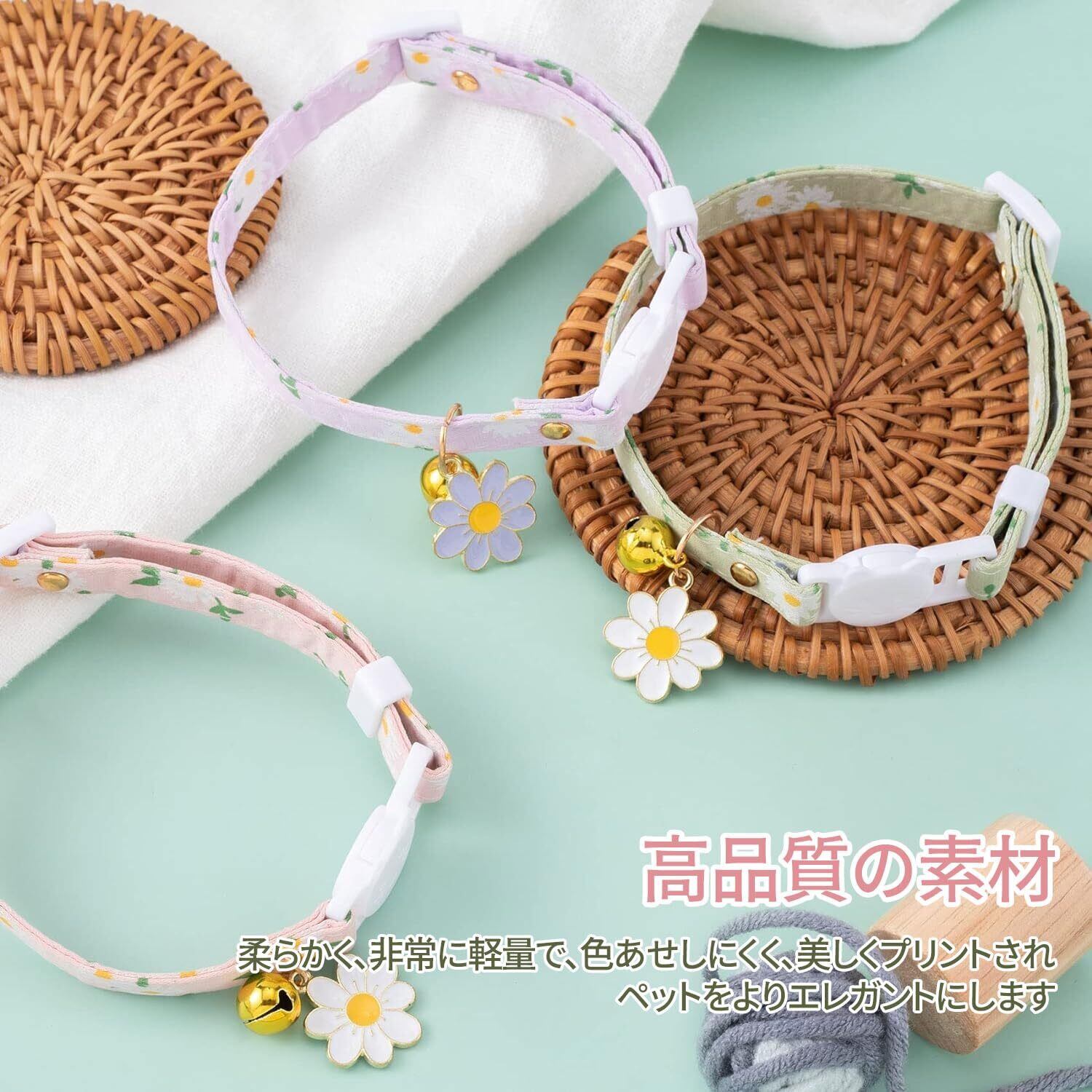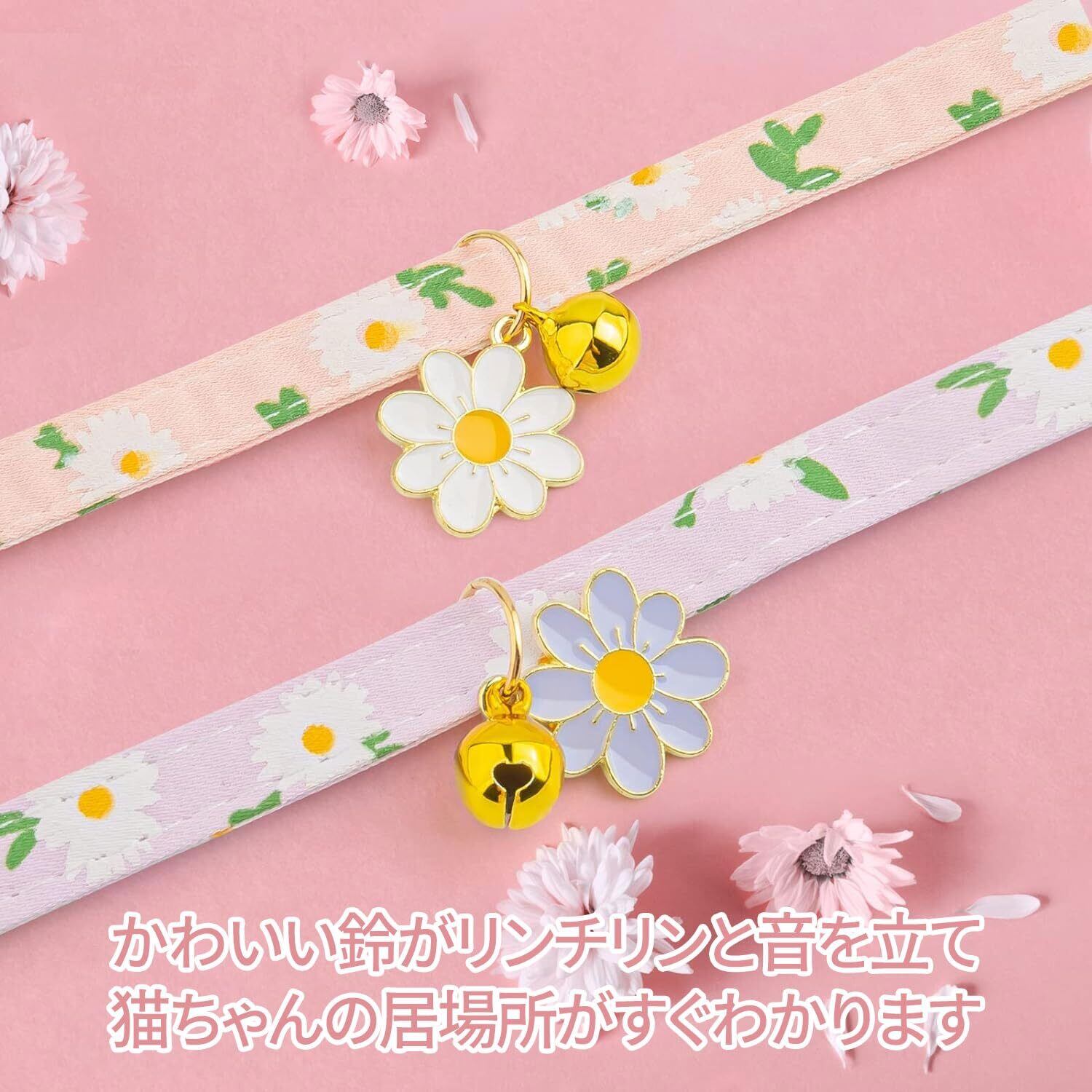 猫 首輪 2個セット 猫 首輪 セーフティバックル 鈴付き デイジー柄 安全留め具 かわいいネックレス 猫の首輪 小動物 小型犬用 超軽量 S 安全 調節可能 ポリエステル綿