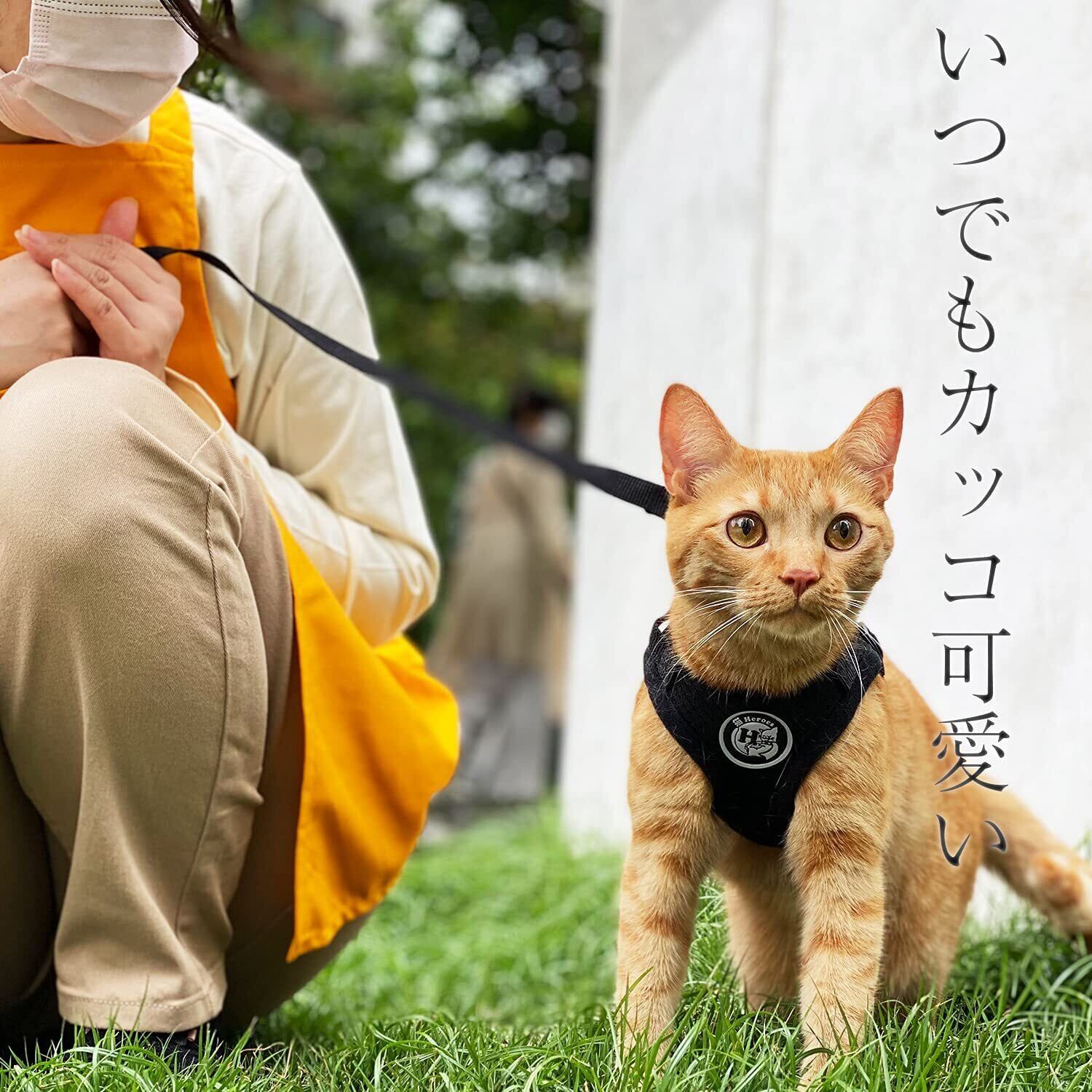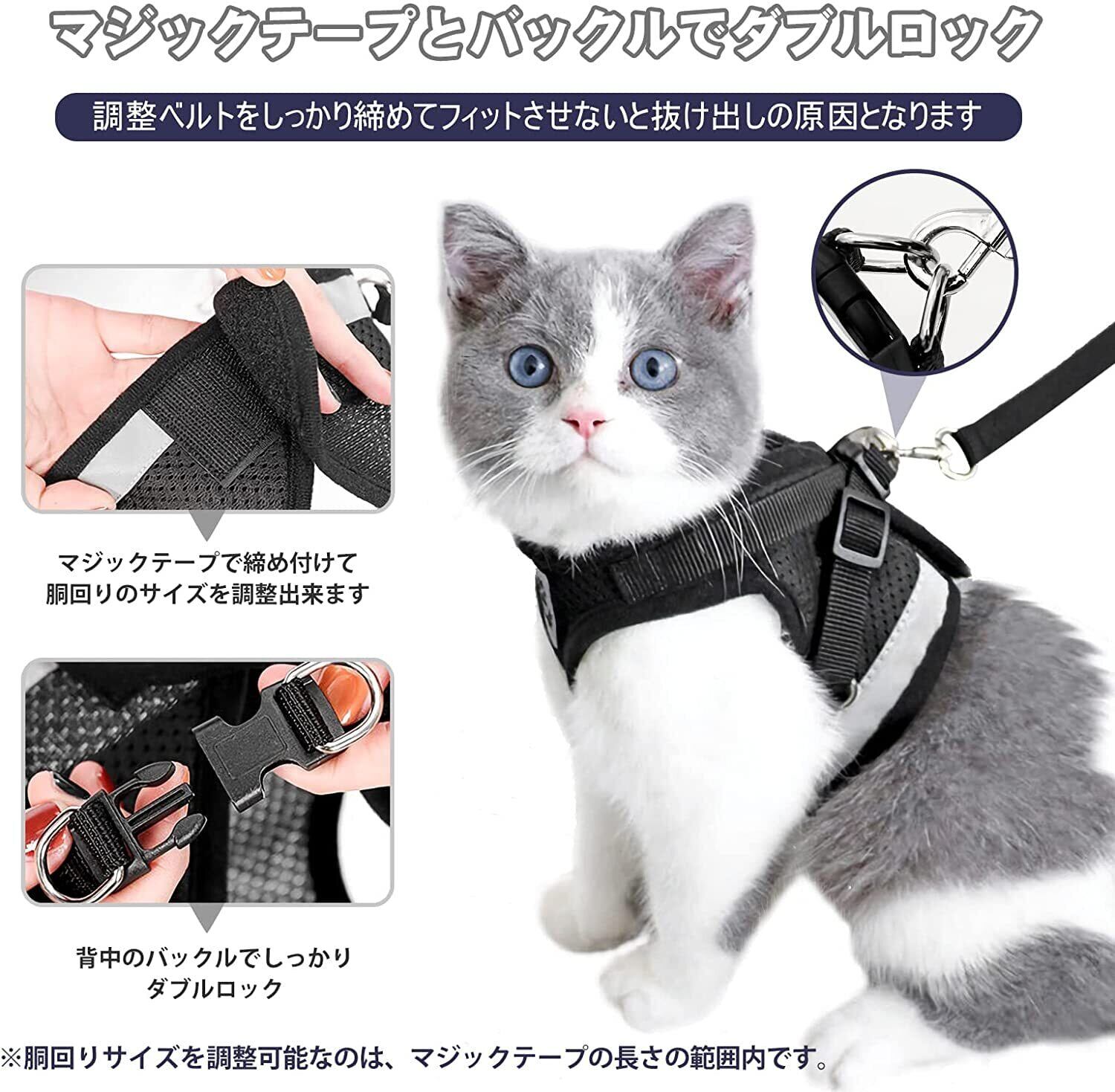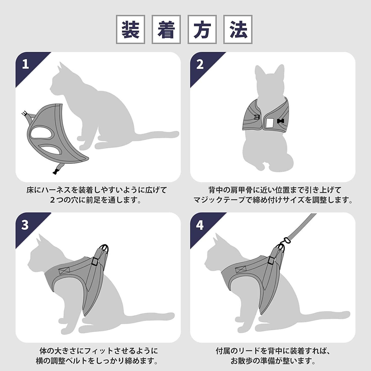 【装着は簡単3ステップ】 装着はとっても簡単!1)猫ちゃんの前足を通す。2)猫ちゃんにハーネスをしっかり固定。3)持ち手のリードを金具に取り付ければお出かけ準備は万端!簡単装着だから、お散歩やお出かけ前のひと手間も楽々。お散歩やお出かけが快適になります。