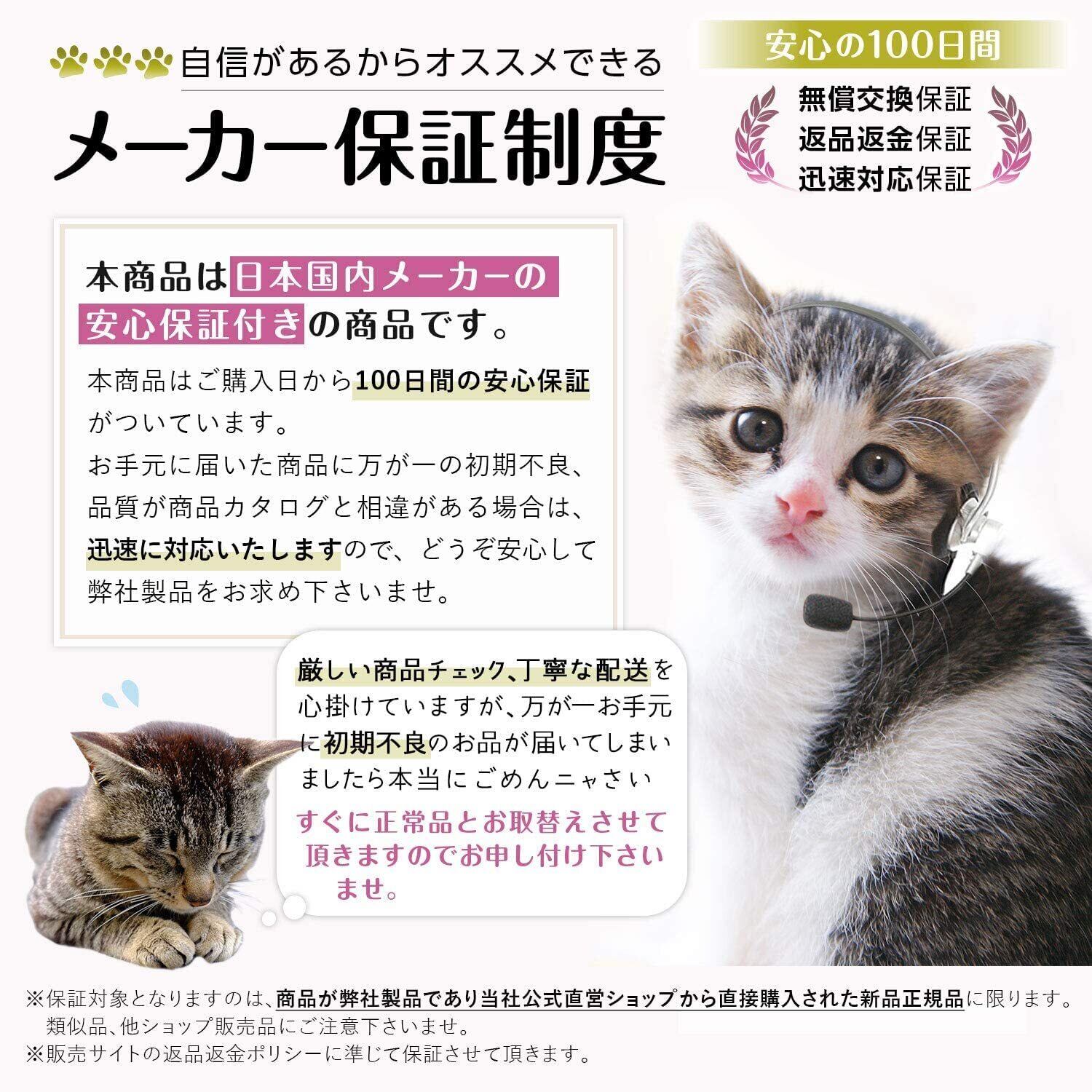 【日本国内メーカー付】 安心の日本製で、もしもの時もメーカーで対応!ご購入から100日間の、無償交換・返品返金・迅速対応がついています。さらに大切な猫ちゃんに直接触れるものだから厳しい商品チェック・丁寧な配送を心がけています。