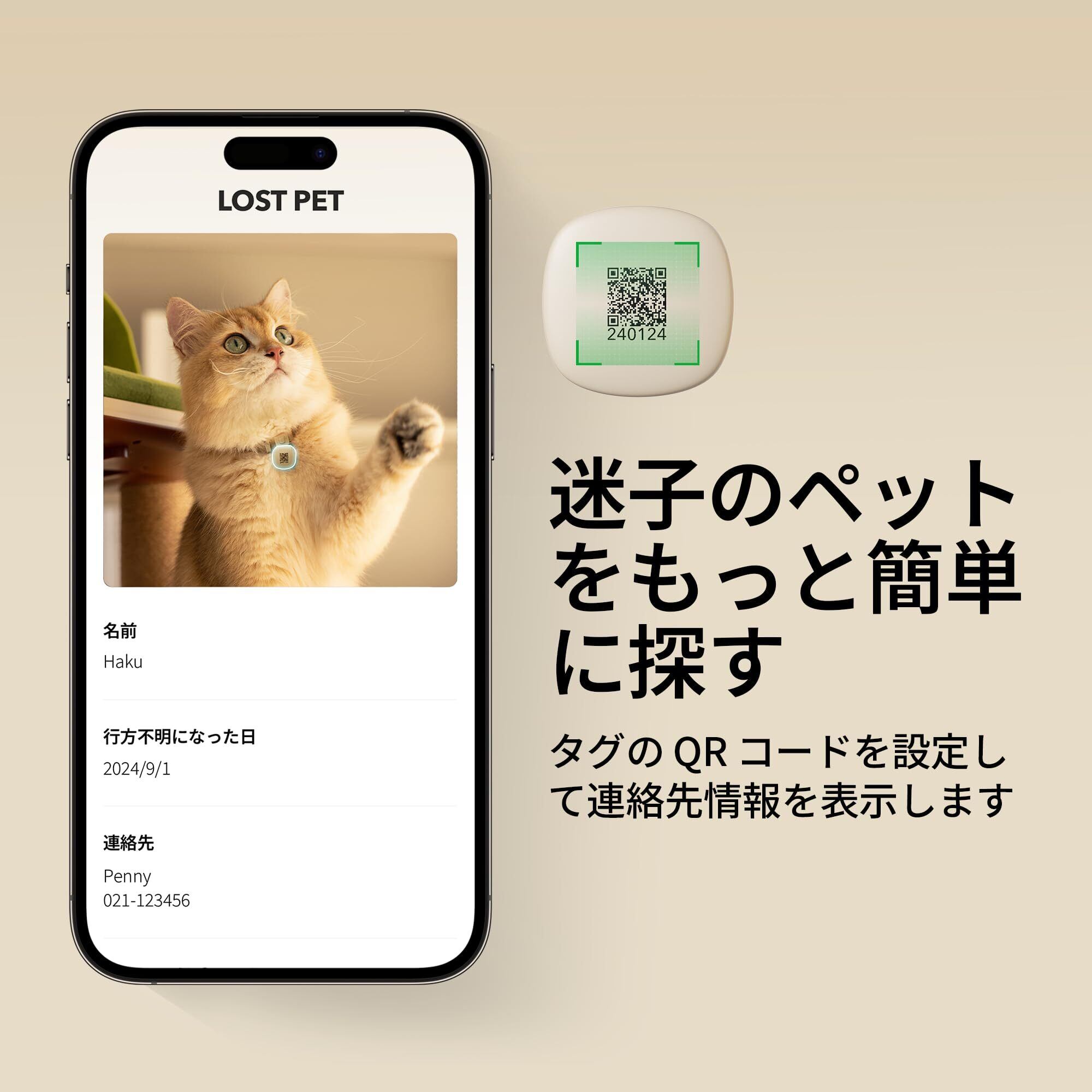 迷子ペットの追跡 タグに内蔵されたQRコードに連絡先情報を保存できます。初回使用時にアプリで迷子登録し、情報を入力することで緊急連絡先も追加可能。いつでもペットの状態を更新できます