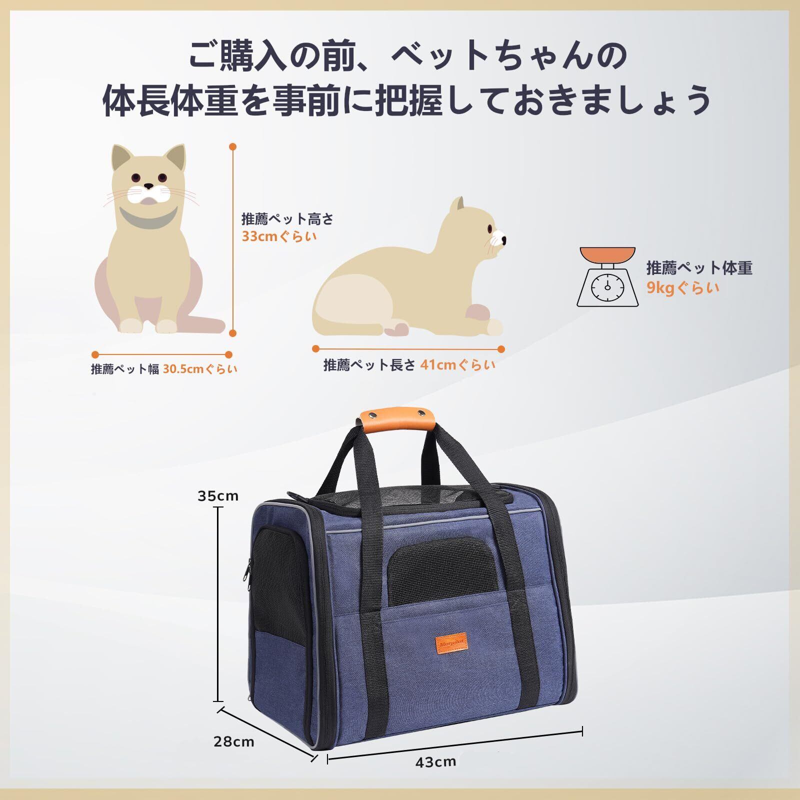 【商品仕様】 展開サイズ:長43 x 幅28 x 高35cm 本体重量:1280g 適用ペット:7kg以内の小型ペット。(中・大型猫用・小型犬用・うさぎ・小型ペットに適用)。付属品:外部/肩掛けベルト、内部/飛び出し防止リード、犬の鉢、やわらか中敷きマット。