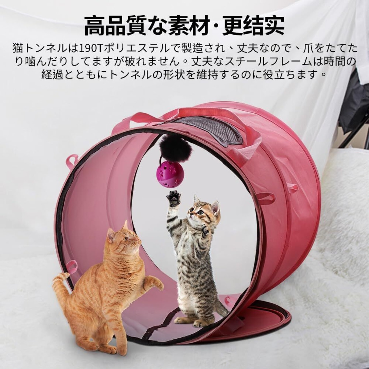 【二重縫製、より丈夫】猫トンネルは190Tポリエステルで製造され、丈夫なので、爪をたてたり噛んだりしてますが破れません。丈夫なスチールフレームは時間の経過とともにトンネルの形状を維持するのに役立ちます。猫だけではなく、子犬、ウサギ、フェレットなど小動物も遊びます。本製品は1年間付き。(お買い上げ日より12ヶ月以内、ご意見もしくはご使用中に不具合等がございましたら、お気軽にご連絡ください。)