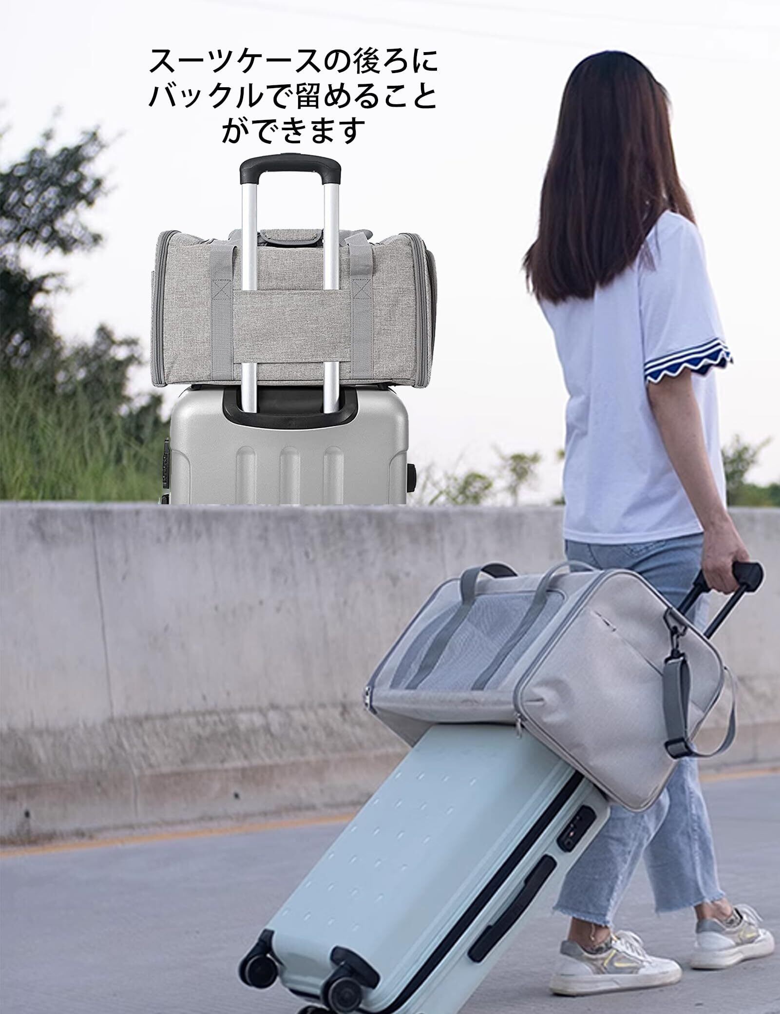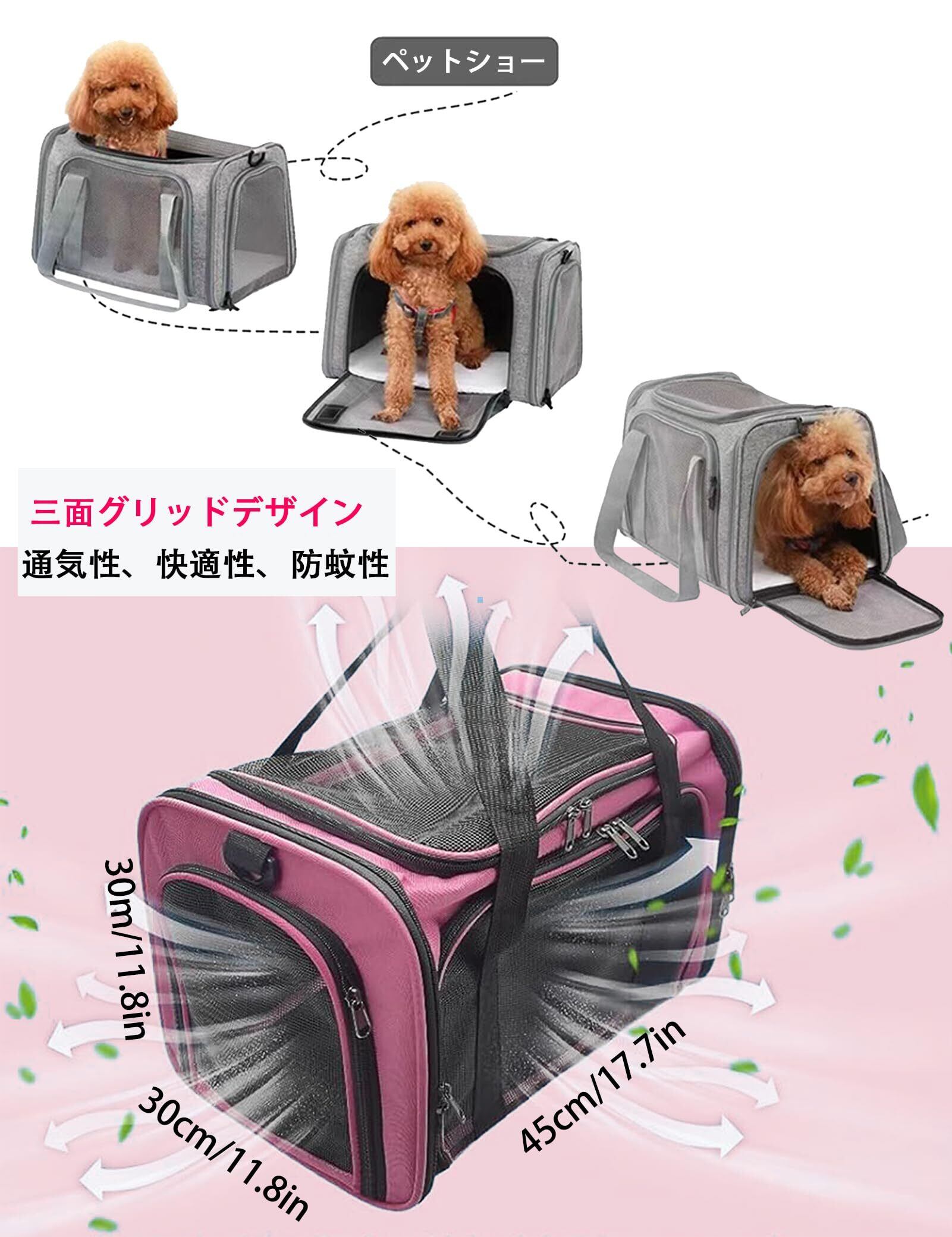 【三面が窓付き、通気性抜群】 ペットキャリー 猫 のぎ三面はメッシュ素材の窓のデザインをしています。 キャリーケース 猫 通気性抜群で、長旅や暑い夏でも心配なく手軽に使えます。 キャリーバッグ 猫 上の窓は大きくて、ペットさんの顔を出せます。 ソフトクレート の中に飛び出し防止のリードが付いております、上の窓が開いてるときにペットさんの飛び出しを防げます