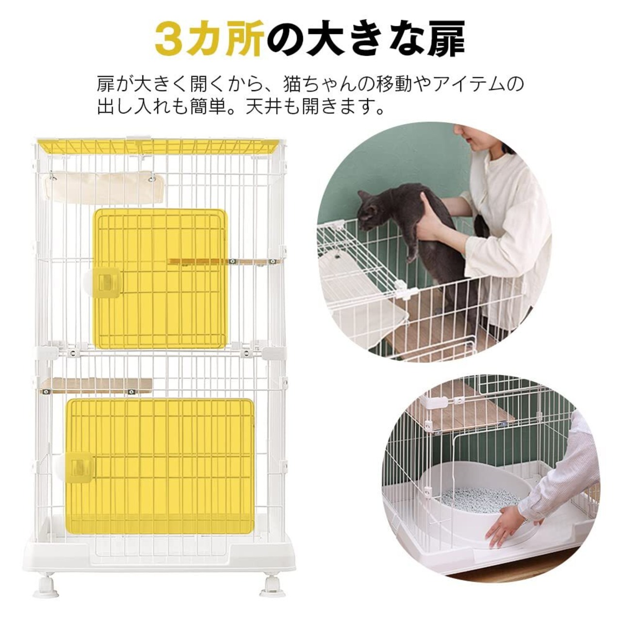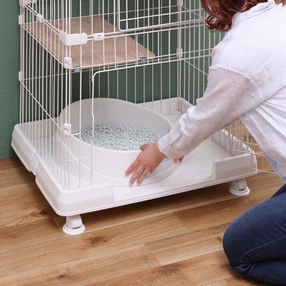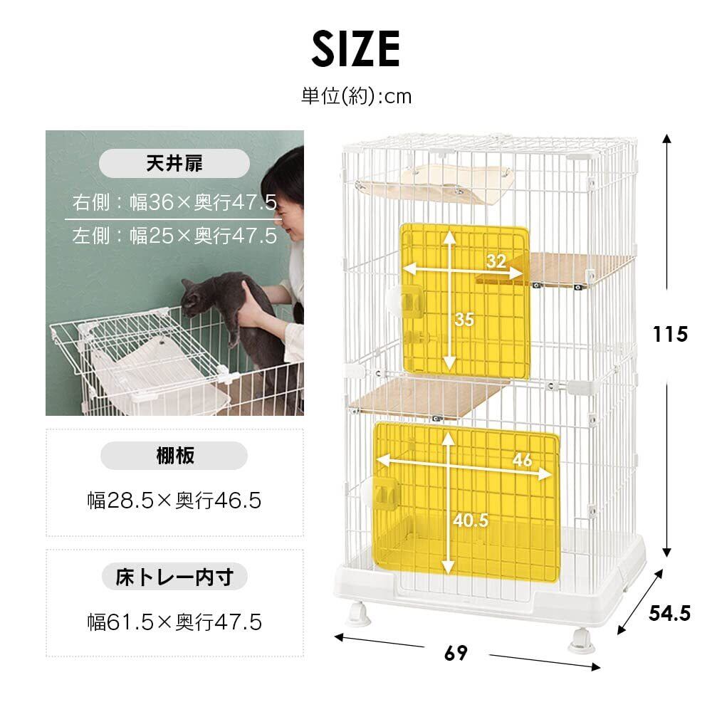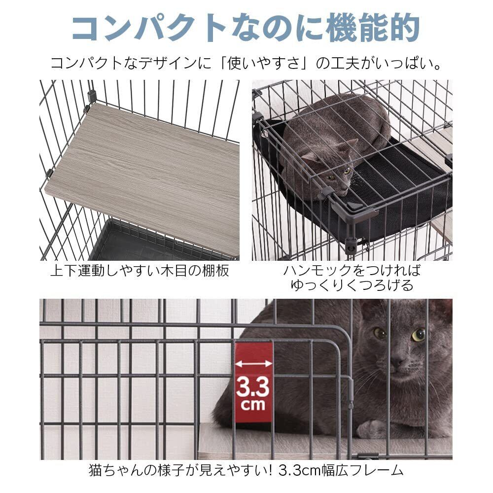 インテリアになじむ、キャットケージ。どんなインテリアにもマッチし、マットな質感でシンプルなデザイン。置く場所を選ばない、コンパクトさ。タテの空間利用で猫ちゃんのリラックススペースをしっかり確保。コンパクトなのに機能的、場所を取らないミニキャットケージ。コンパクトなデザインに「使いやすさ」の工夫がいっぱい。・棚板2枚で、上下運動。・天井扉つきでお世話がしやすい。・ゆっくりくつろげるハンモックは頑丈なS字フックでしっかり固定。・猫ちゃんの様子が見えやすい、3.3cmの幅広フレーム。・トイレ置き場にすれば、お部屋はすっきり。・キャスター付きで掃除もしやすい。【こだわりポイント】◆丈夫な2枚の木目調棚板おもちゃやベッド置き場にピッタリの木製棚板。猫ちゃんの上下運動にも。◆安心のこだわり設計線材には剛性に強いスチールを使用しているので曲がりにくく、丈夫です。線材は粉体塗装で、傷・サビに強い仕様です。有機溶剤を使用していないので、ねこちゃんも安心して使えます。◆3カ所の大きな扉扉が大きく開くから、猫ちゃんの移動やアイテムの出し入れも簡単。天井も開きます。◆安心のロック猫ちゃんがイタズラしにくいつまみタイプのロック。◆キャスター付きでお掃除しやすいキャスター付きだから、ほこりや猫砂、猫の毛などのお掃除がしやすく衛生的な環境を保てます。◆簡単組み立てジョイントパーツでパネルをつなぎ、棚板を取り付けるだけ、※棚板取り付け時のみプラスドライバーが必要です。◆選べる2カラーお部屋の雰囲気に合わせて選べます。お客様組立