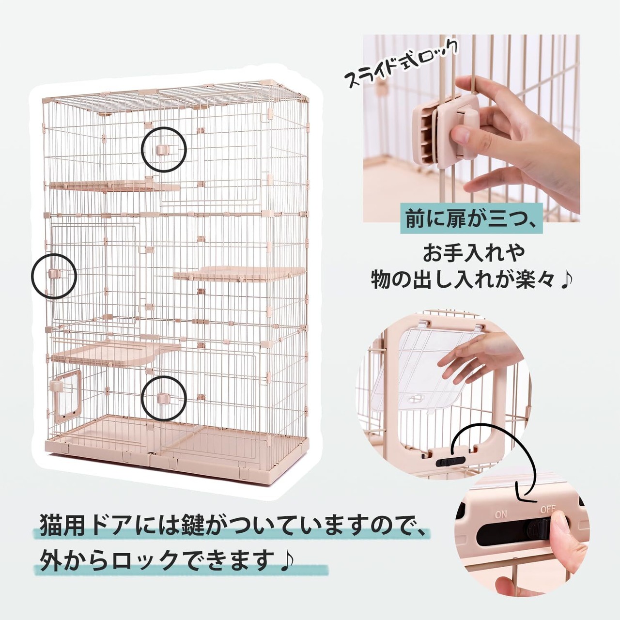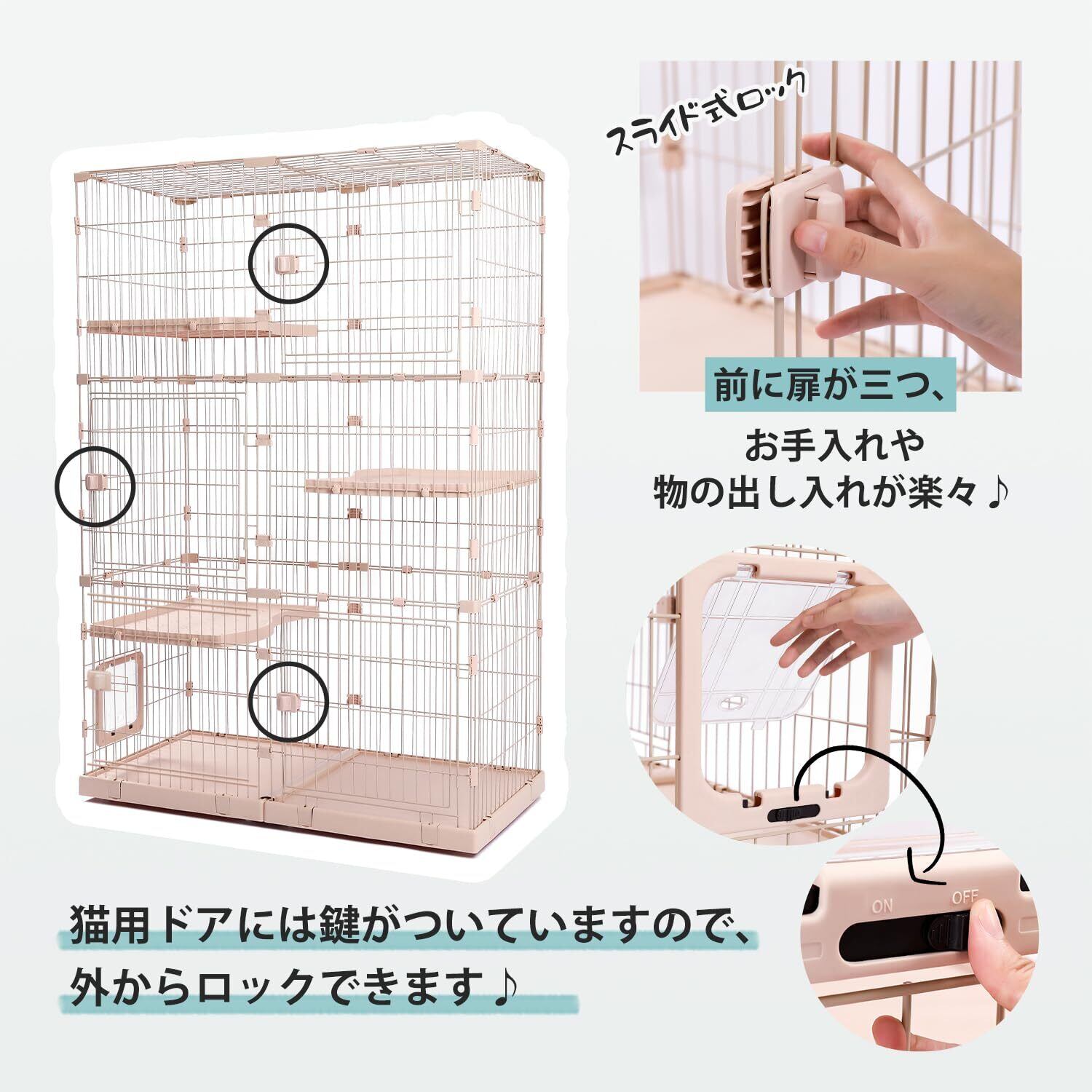 PETEPELA(ぺテぺラ) 猫 ケージ 大型 3段 広い 2段 多頭飼い キャットケージ 猫用エンクロージャ キャスター/ローラー 大きい/でかい 増やせる/拡張 ワイド ケージセット メインクーン ラグドール 組み立て簡単 足場 室内飼い - L ベージュ 幅123×奥行62.5×高さ184.5cm