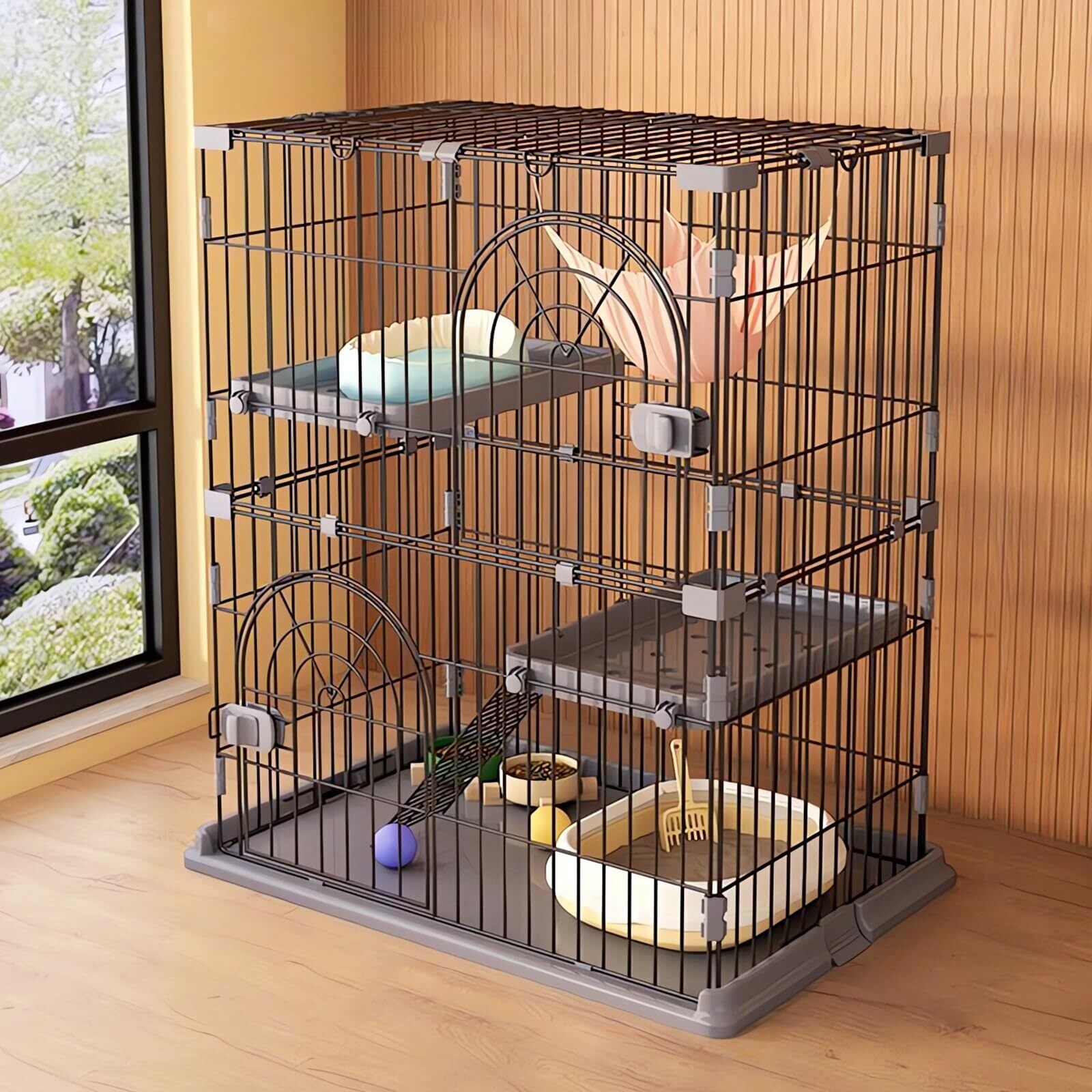 【多頭飼い可能】すでに猫を飼っている飼い主が、新たな猫と共に多頭飼いを始める、3段、4段タイプの猫ゲージ、広々としたスペースで子猫たちが自由に上下運動することができます。子猫を2、3匹飼っていても窮屈さを感じません。各段目に棚板が1枚付き、猫のお気に入り物を置いて、子猫が楽しく遊べるようにします。