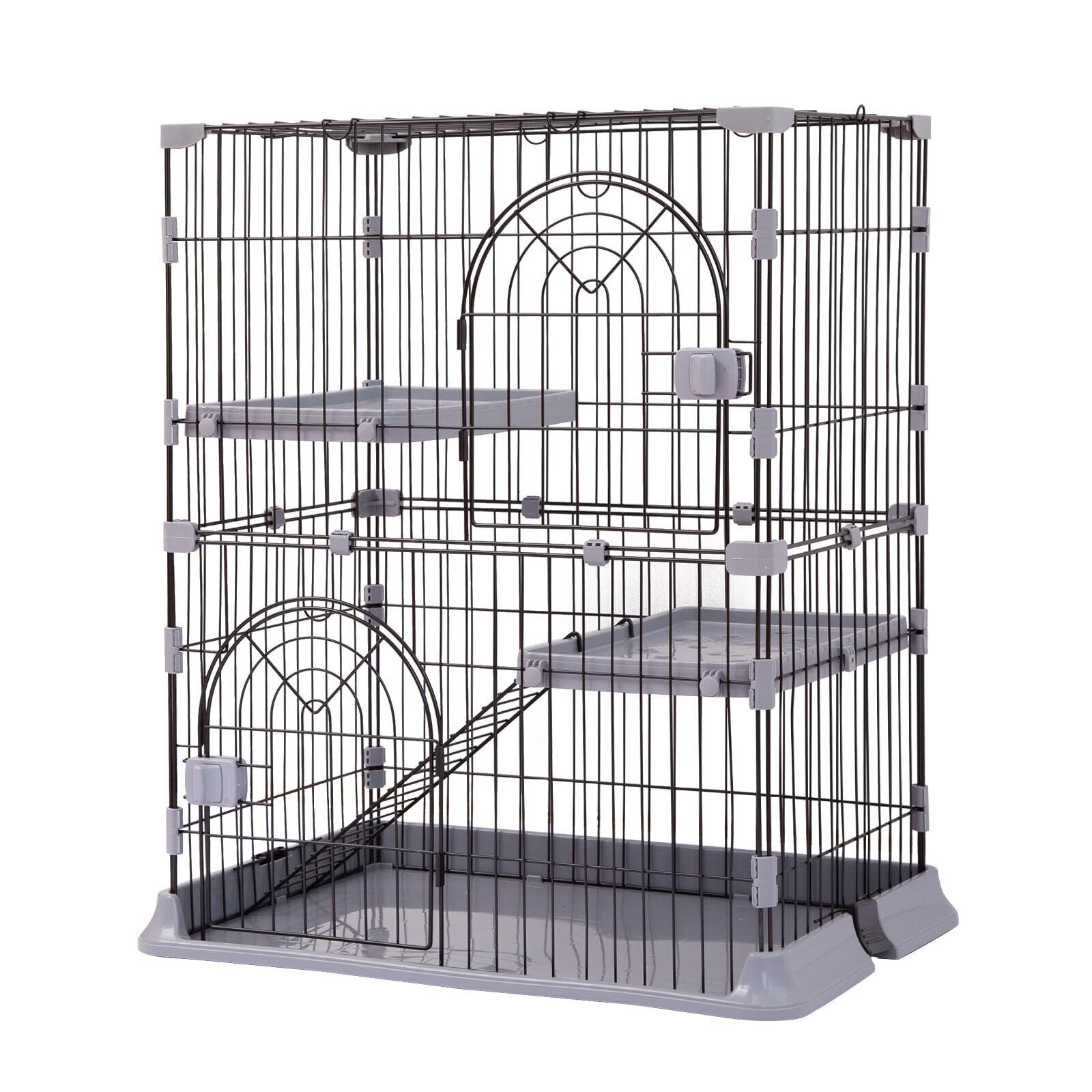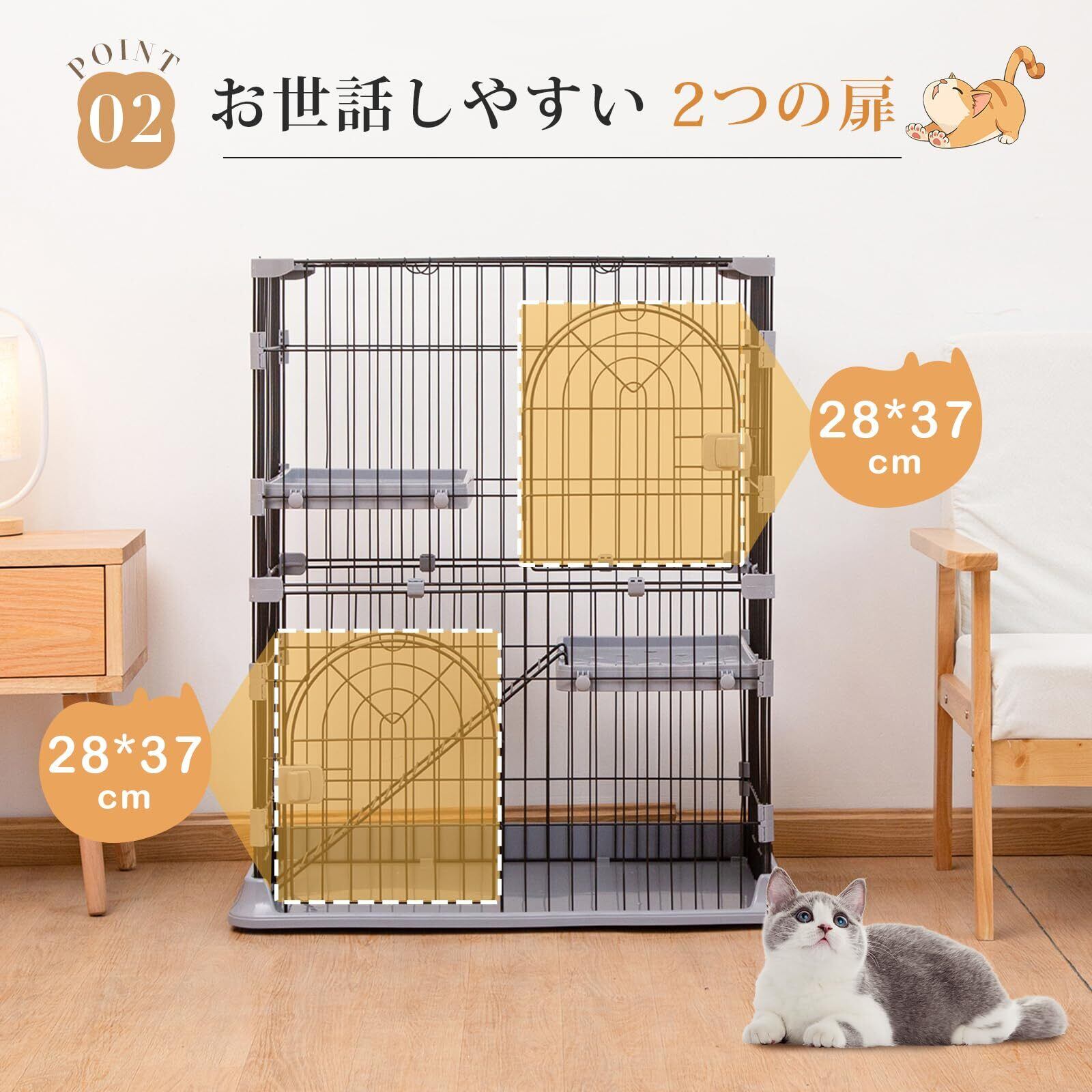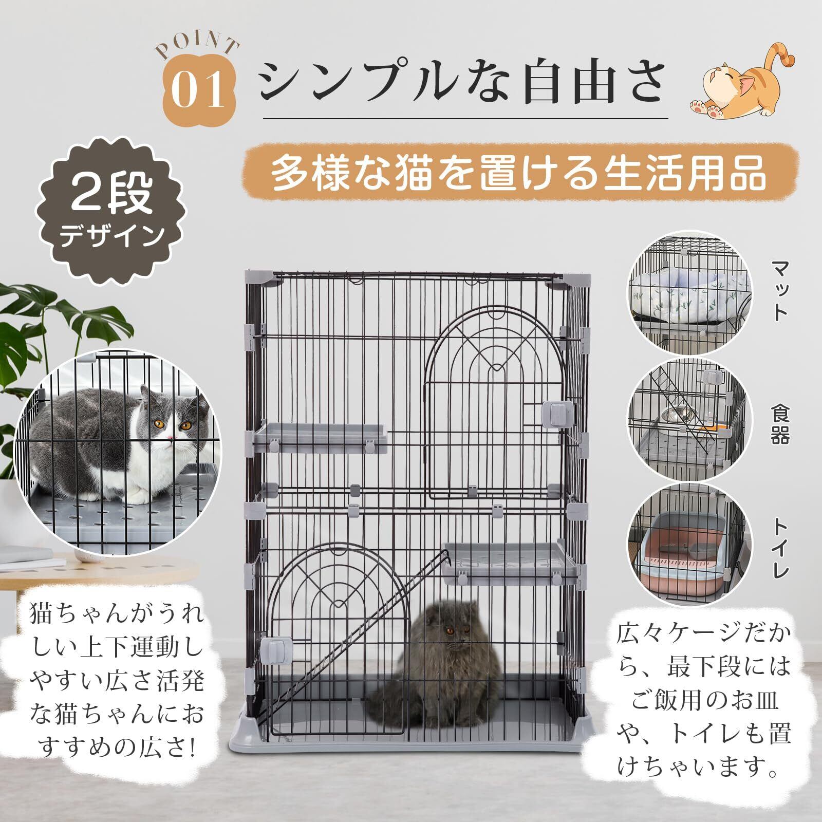 PETTOM 猫 ケージ キャットケージ 2/3段 猫ゲージ ワイド扉 多頭飼い 脱走防止 留守番 保護 脱走防止 多頭飼い 多頭 スチール ペットケージ (グレー色2段 74*50*89cm)