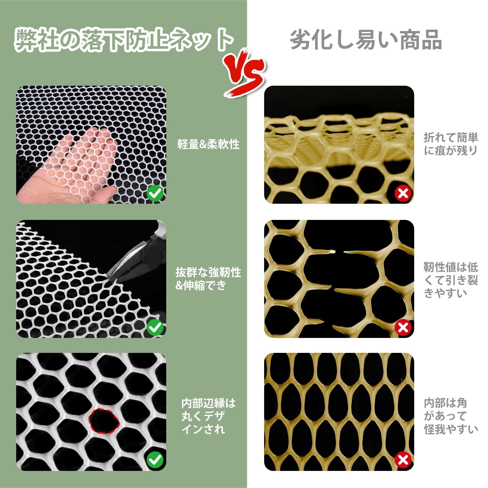 【安全プラスチックネット】金属製ネットの信頼できる代替品としてご使用いただけます。また、指を挟みにくいよう内部の菱形構造を丸く設計しており、お子様やペットの出入りがある場所でも安全に設置できます。