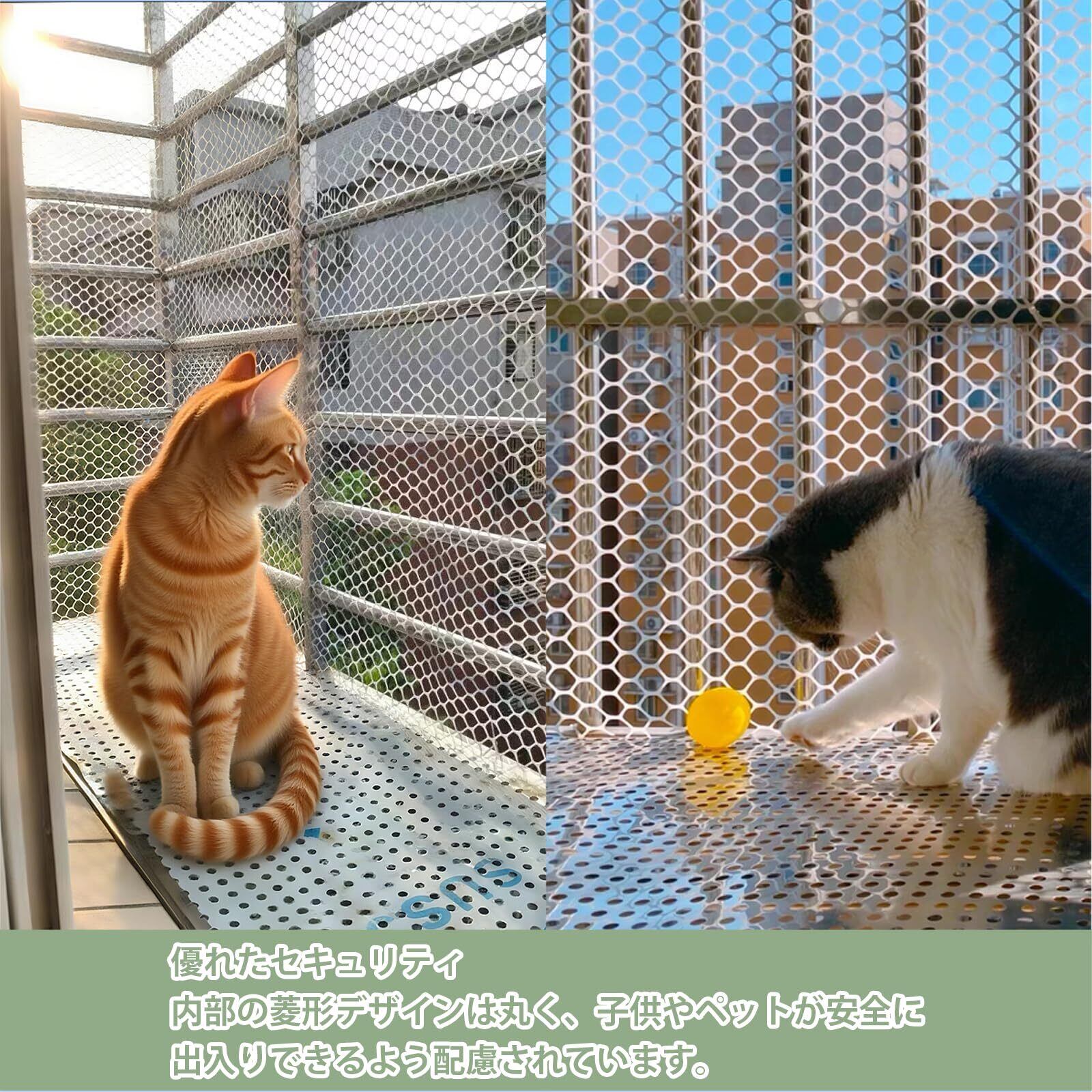 【PE素材転落防止ネット】高密度PEプラスチック製で、耐日光性、耐久性、耐摩耗性、耐腐食性、耐裂性に優れています。長期間使用しても色褪せや剥がれを防ぎます!猫ちゃんが破いてしまっても破れにくいです。また、軽量で柔らかく、柔軟性に優れているため、曲げたり切ったりしやすいです。