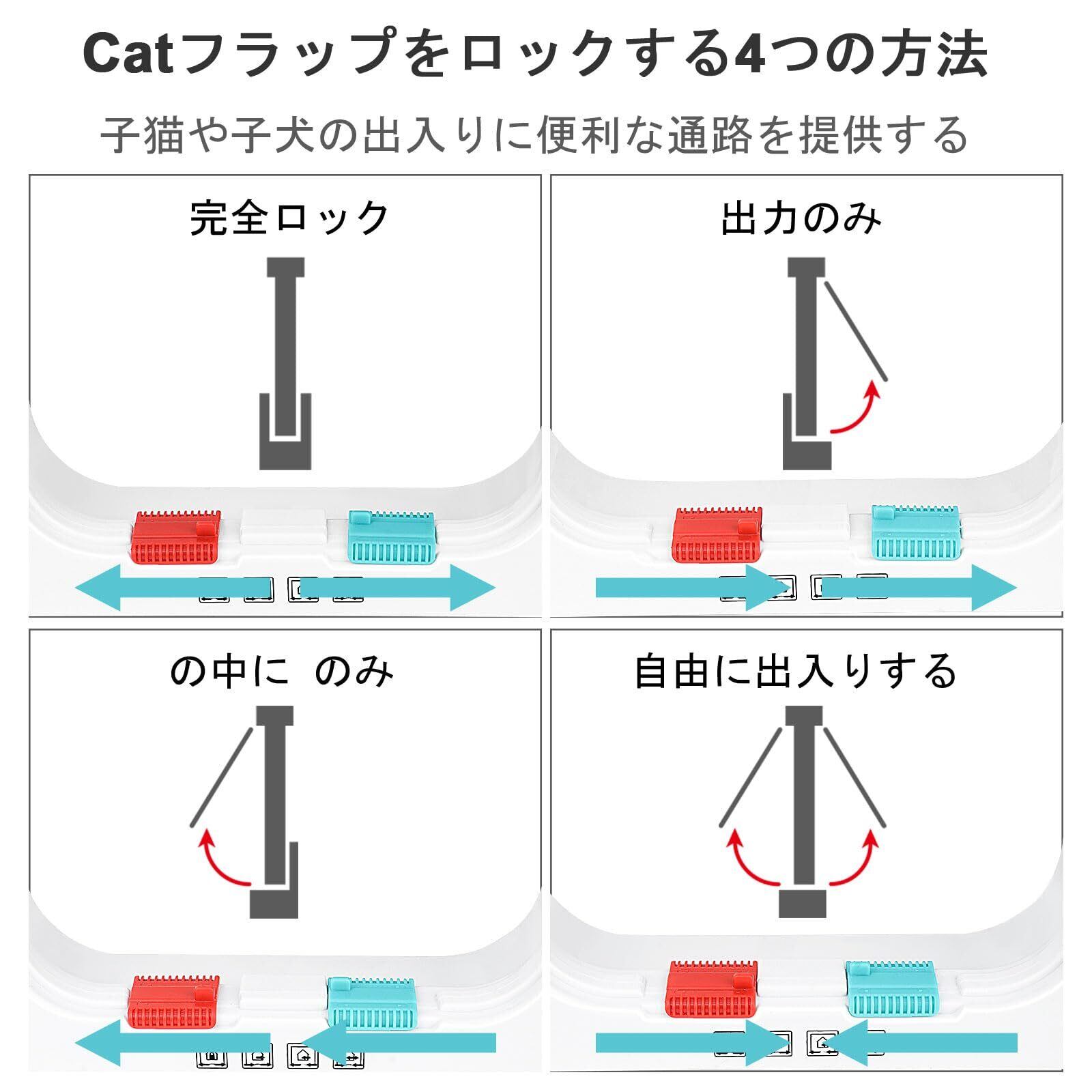 4つのロックモードをより安全に-スライドスイッチにより、アクセスモードを自由に出入り、完全にロック、出入りのみ、入場のみに調整し、ペットのアクセスを制御し、放浪動物から遠ざけることができます。