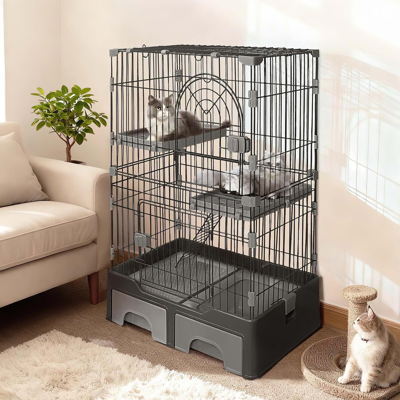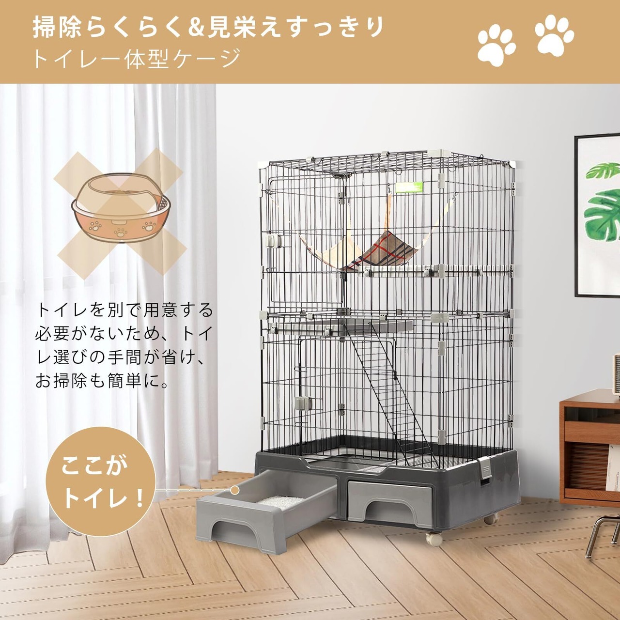 【多機能デザイン】この猫ケージは、猫用トイレ、引き出し、ハンモック、はしごを備えた多機能設計で、猫のさまざまなニーズを満たし、ペットが自宅で快適で安全な空間を楽しめるようになっています。