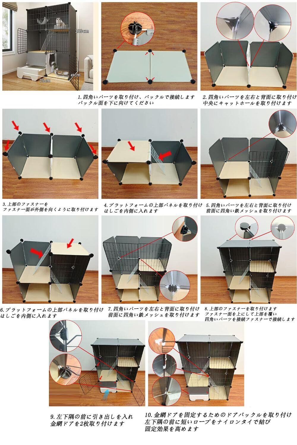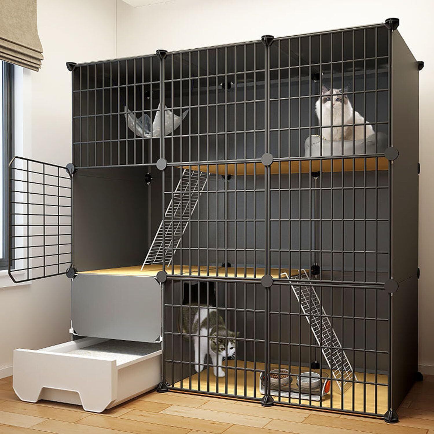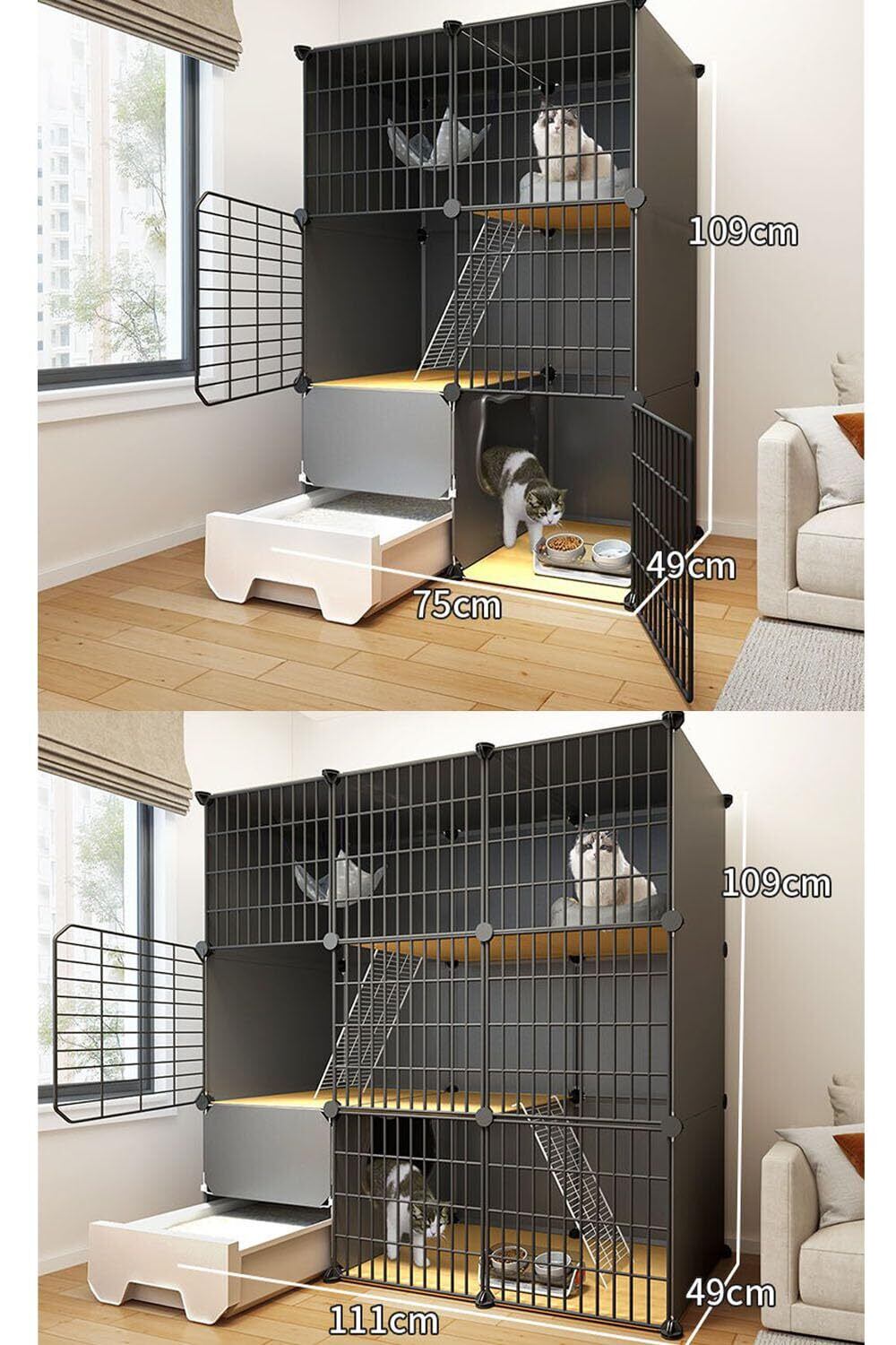 【お掃除簡単/組み立てが】この3段キャットゲージには引き出し式トイレが装備されており、猫砂の交換が容易になるように設計されており、掃除がより便利です。同時に、半密閉型の形状は、臭いの漏れを効果的に防ぎ、飛沫を防ぐことができ。猫用ケージの各パーツは自由に組み立てられるので,組み立ては簡単で、一人でも完成できます。