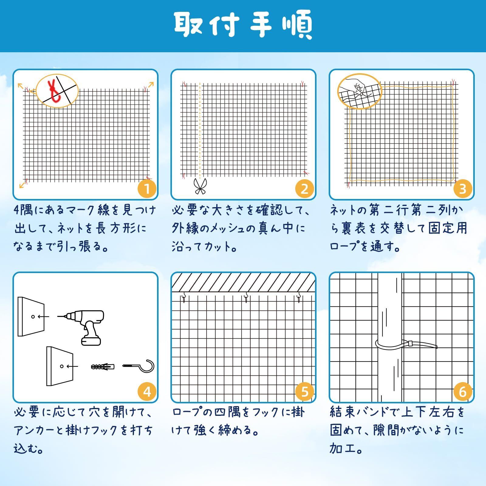 「取付簡単」 ネットを展開して、ベランダや窓に合わせて必要な大きさまで裁断します。ハサミで簡単にカットできます。付属のフック、結束バンドで隙間なく固定して完成です。強化樹脂+ステンレス製のため、傷つけないようにエッジの部分を丁寧に加工してください。参考用の日本語説明書が付属されております。
