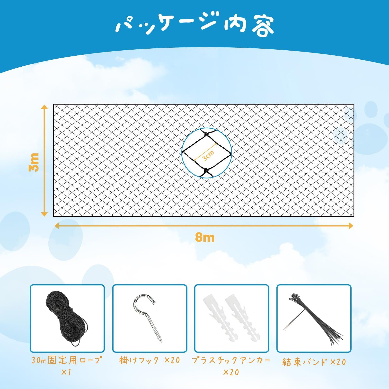 「パッケージ内容」 パッケージ内には3m×8mの脱走防止ネットが一つあります。付属品には固定用のロープ30m、フック20個、アンカー20個及び結束バンド20個あります。ロープで枠を作って、アンカーとフックを壁に打ち込んでネットを掛けて、最後に結束バンドで隙間をしっかり埋めて完成です。パーツが足りない、または長さに不足がある場合は、直接注文履歴から出品者までご連絡ください。
