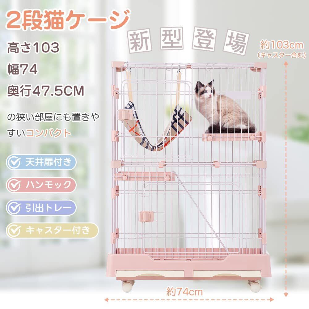 BTM キャットケージ 2段 猫 ケージ ハンモック付 引出しトレー付 キャスター付 天井扉 ペットケージ キャットハウス 留守番 保護 脱走防止 おしゃれ