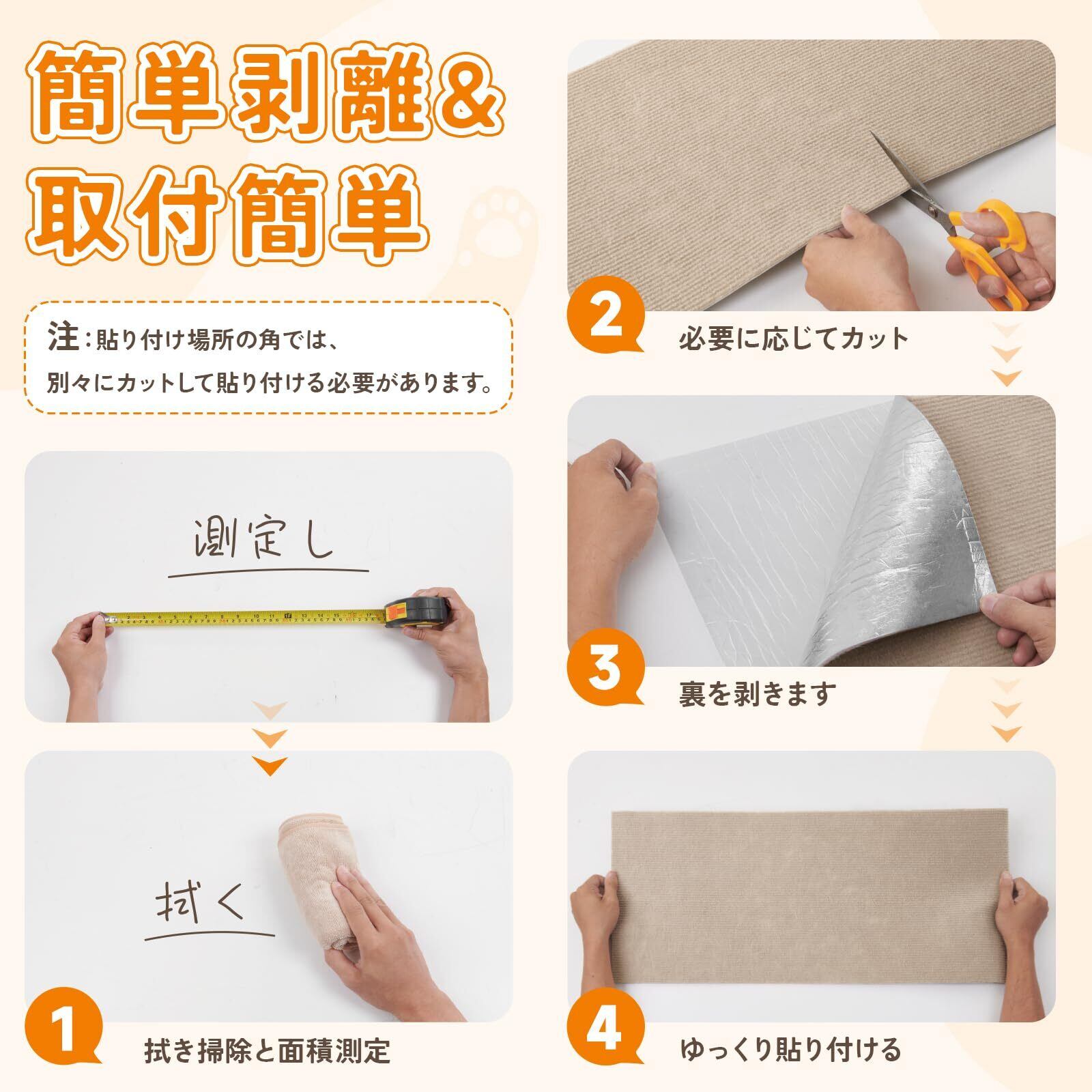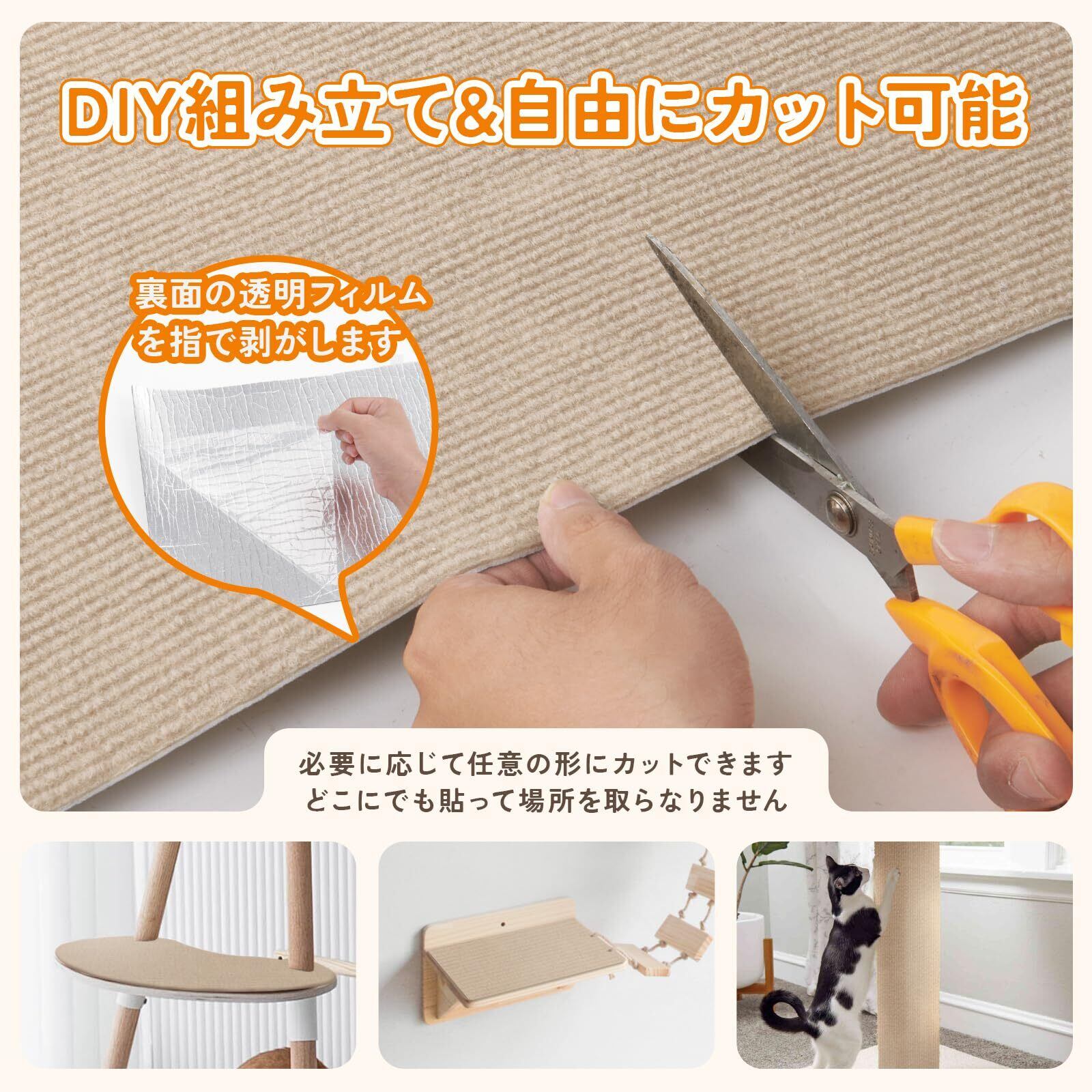 【簡単剥離&取付簡単】:猫つめとぎシートは、自己粘着式の裏面を持ち、取り付けが非常に簡単です。裏面の保護膜を剥がし、床や家具の表面に貼り付けるだけで、素早く取り付けができます。このシンプルな取り付けは飼い主にとって手間がかからず、猫にいつでも使える環境を提供します。また、爪研ぎシート 壁は取り外し可能で再利用できるため、角から剥がすことで簡単に全体を取り外せます。ヒント:取り付ける表面を清掃し、汚れや埃がないことを確認してください。壁に貼り付ける必要がある場合は、タイル壁や木の壁をお勧めします。灰泥壁に貼り付けないでください。取り外す際に壁が損傷する可能性があります。貼り付けた場所の角では、カットして個別に貼り付ける必要があります。剥がすときに水を少し加えると接着剤が取れるので、剥がして貼り直すのが早くなります。