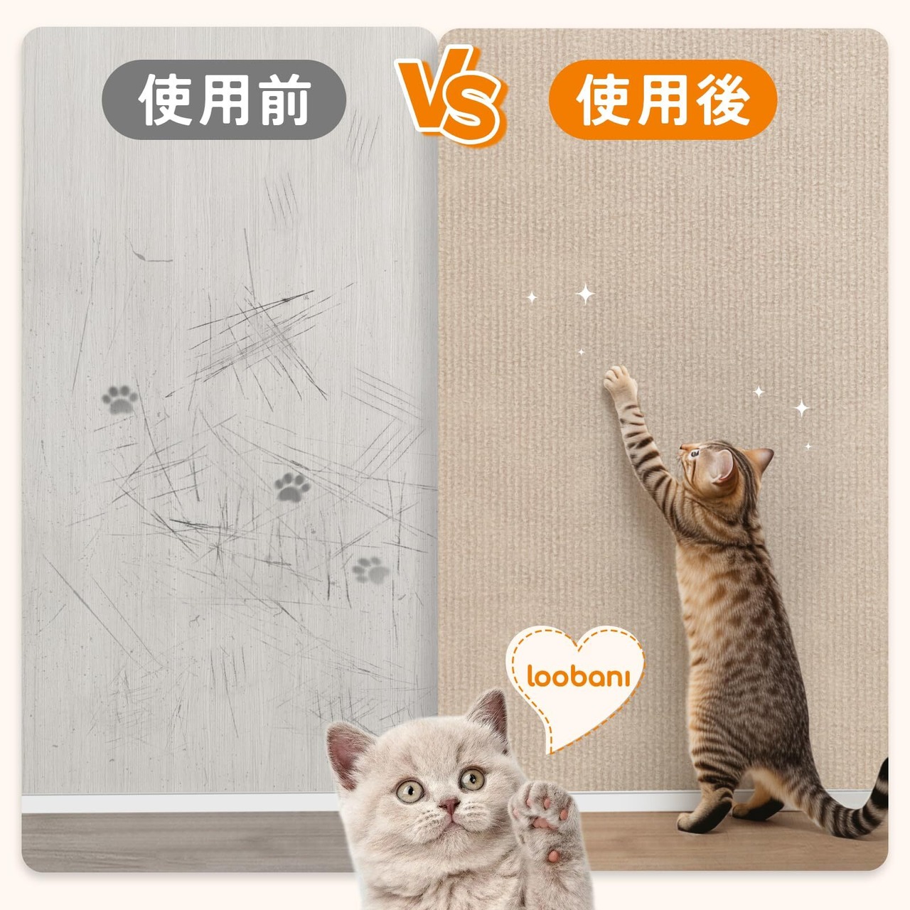 【品質】 : LOOBANI爪研ぎシート安心アフターサービス。当社の猫 爪研ぎ防止シートおよび出荷に関するご質問がございましたら、お気軽にサポートメールまでお問い合わせください。24時間に対応します。ヒント:角に貼る際は、製品を切り分けて貼り付けてください。ソファやベッドの側面に貼る場合は、布用テープを使用することをお勧めします。