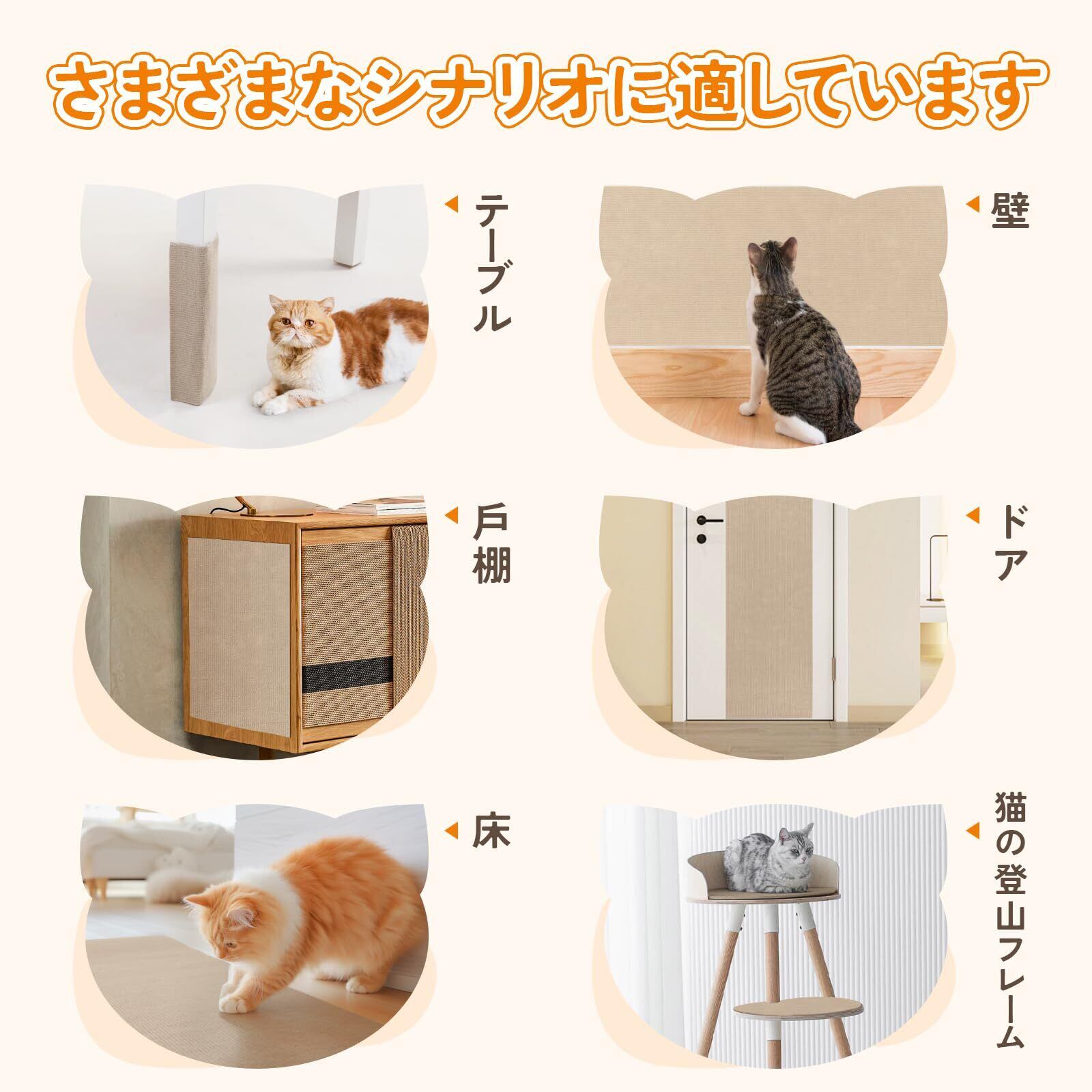 【多用途&適用場所】:猫 爪研ぎマットは、リビング、寝室、キッチンなど猫がよく出入りする場所だけでなく、玄関やバルコニーなどさまざまなシーンでも使用できます。タイルの壁、床、ドア、キャビネット、ソファなど、さまざまな家具に貼り付けることができます。猫のベッドやマットとしても兼用でき、猫がよくいる場所に配置することで使用頻度を増やすことができます。自宅だけでなく、賃貸住宅、会社の住居、新築の建物でも安全に使用できます。