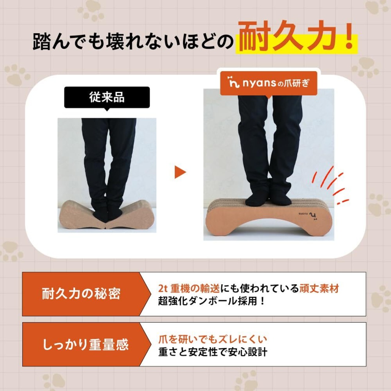 ⦅超強化ダンボール使用で従来商品よりも3倍長持ち!⦆ニャンズの 爪研ぎ に使用されている超強化ダンボールは、2トンの重機を輸出する際に使用されるほど頑丈なダンボール界の王様です。ピカイチの耐久性で、猫1匹ならば両面使用で1年以上の長持ちを実現します。