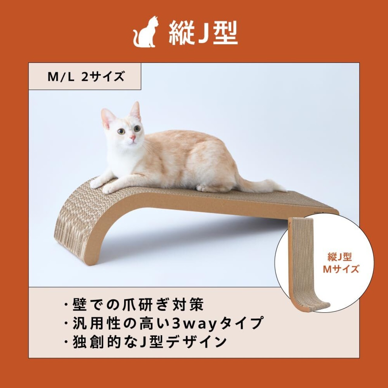 ⦅待望の縦J型が新登場!⦆ 両面使える画期的な3wayタイプの縦J型 爪研ぎ が、ついに完成しました!「そのまま縦で」「カーブを上にした横向きで」「カーブを下にした横向きで」3通りの使い方ができます。思う存分 爪研ぎ ができるので、壁の 爪研ぎ 防止にもなります!思いっきり爪を研ぐ場所がないから壁をガリガリ…なんて心配もゼロ!