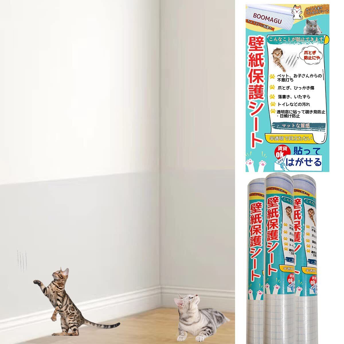 BOOMAGU 【獣医師監修】はがせる 猫 壁紙保護シート 半透明 猫 つめとぎ 防止 シート 貼りやすい 爪研ぎ防止シート 使いやすい 目立ちにくい汚れ防止 猫ひっかき防止 (45CM*2.5M)