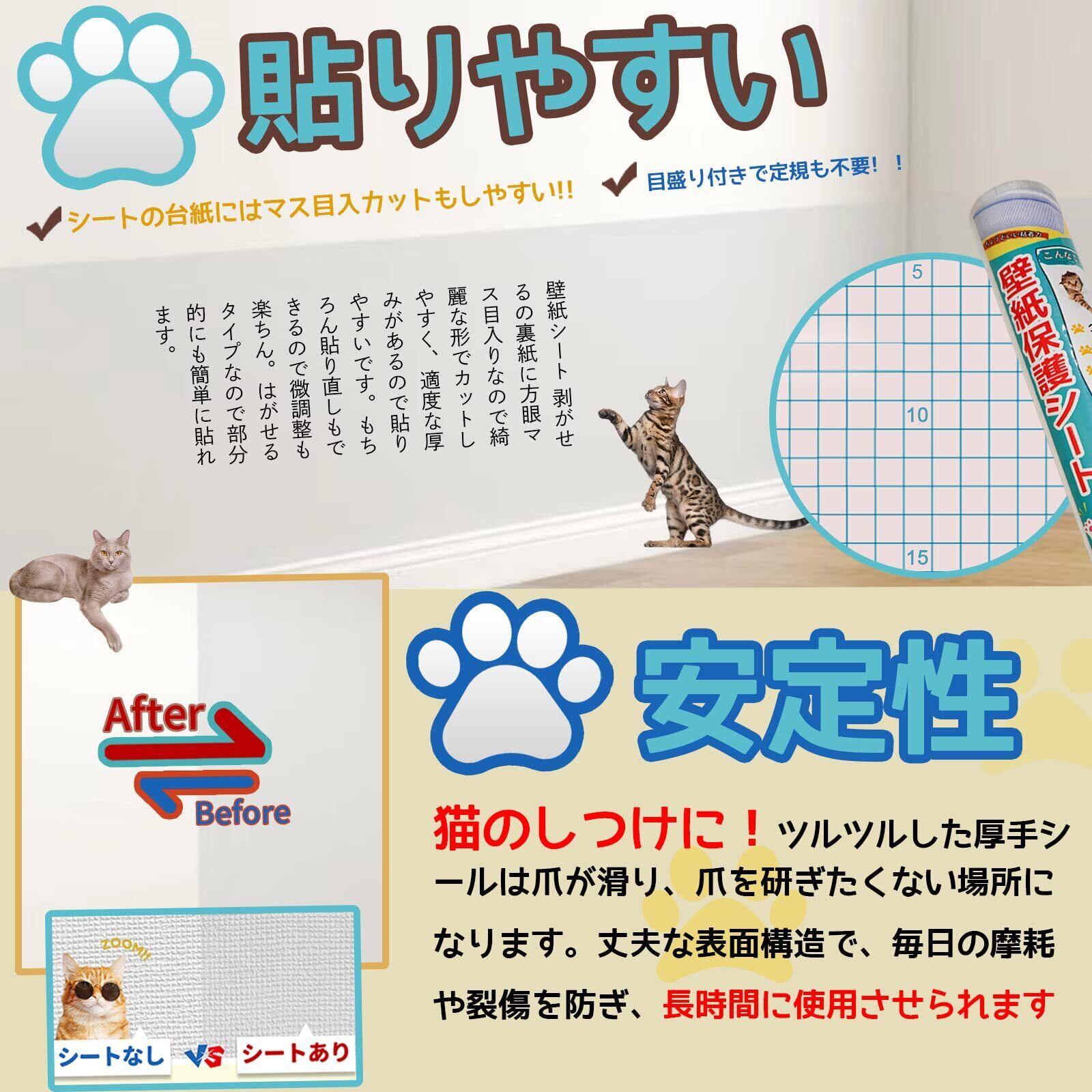 【貼りやすく剥がしやすい】壁保護シートは方眼入りの剥離紙でサイズを測りながら簡単カット。仮止めができるので、シワを伸ばしながら位置を調整でき、貼り直しも可能です。爪研ぎ防止シートはDIYが初めての方にもおすすめ。