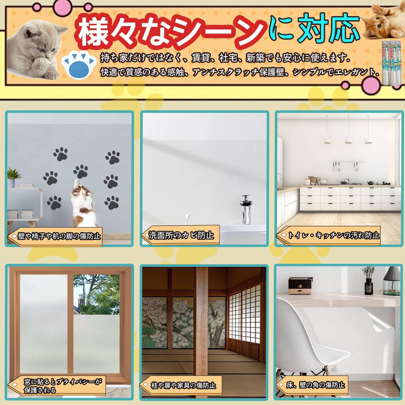 【家中の気になる場所をカバー】壁汚れ防止シートはリビング、寝室、廊下など、家の中のさまざまな壁紙に貼ってご使用いただけます。また、ソファの側面、ドア、テーブル脚など、ペットが傷つけがちな家具の保護にも幅広くお使いいただけます。