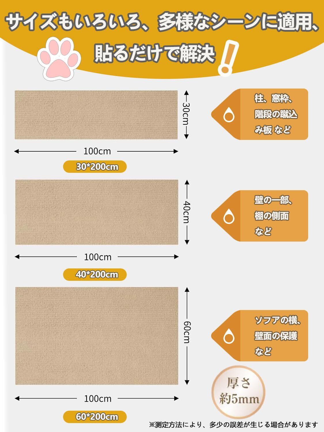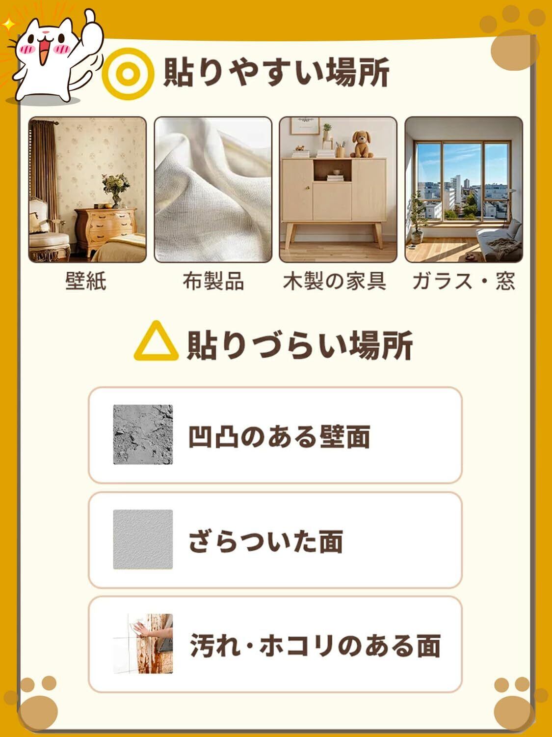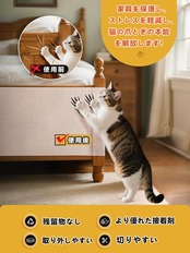 【多用途&適用場所】:猫用爪とぎマットは、リビングや寝室、キッチンといった猫がよく過ごす場所はもちろん、玄関やバルコニーなど、様々な場面で活用できます。タイル壁やフローリング、ドア、キャビネット、ソファなど、多様な家具表面に貼り付け可能です。ご自宅はもちろん、賃貸住宅やオフィス、新築物件でも、壁や床を傷つける心配なくお使いいただけます
