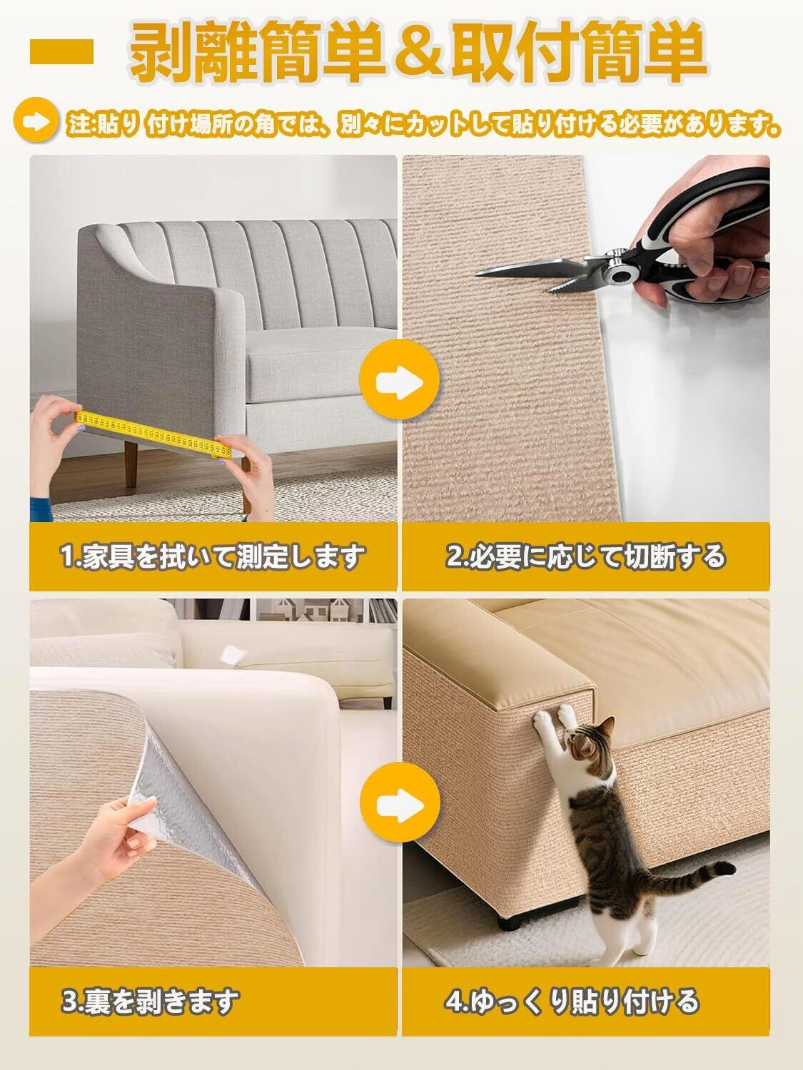 【取付も剥離も簡単】:猫つめとぎシートは剝がせるタイプとして最適な粘着力が持ちます。自己粘着式の裏面なので、取り付けは非常に簡単です。保護フィルムを剥がし、サイズに合わせてカットし、床や家具の表面に貼り付けるだけで、あっという間に設置が完了します。また、角から剥がすことで簡単に全体を取り外せます。※取り付ける表面を清掃し、汚れや埃がないことを確認してください。壁に貼り付ける必要がある場合は、タイル壁や木の壁をお勧めします。灰泥壁に貼り付けないでください。