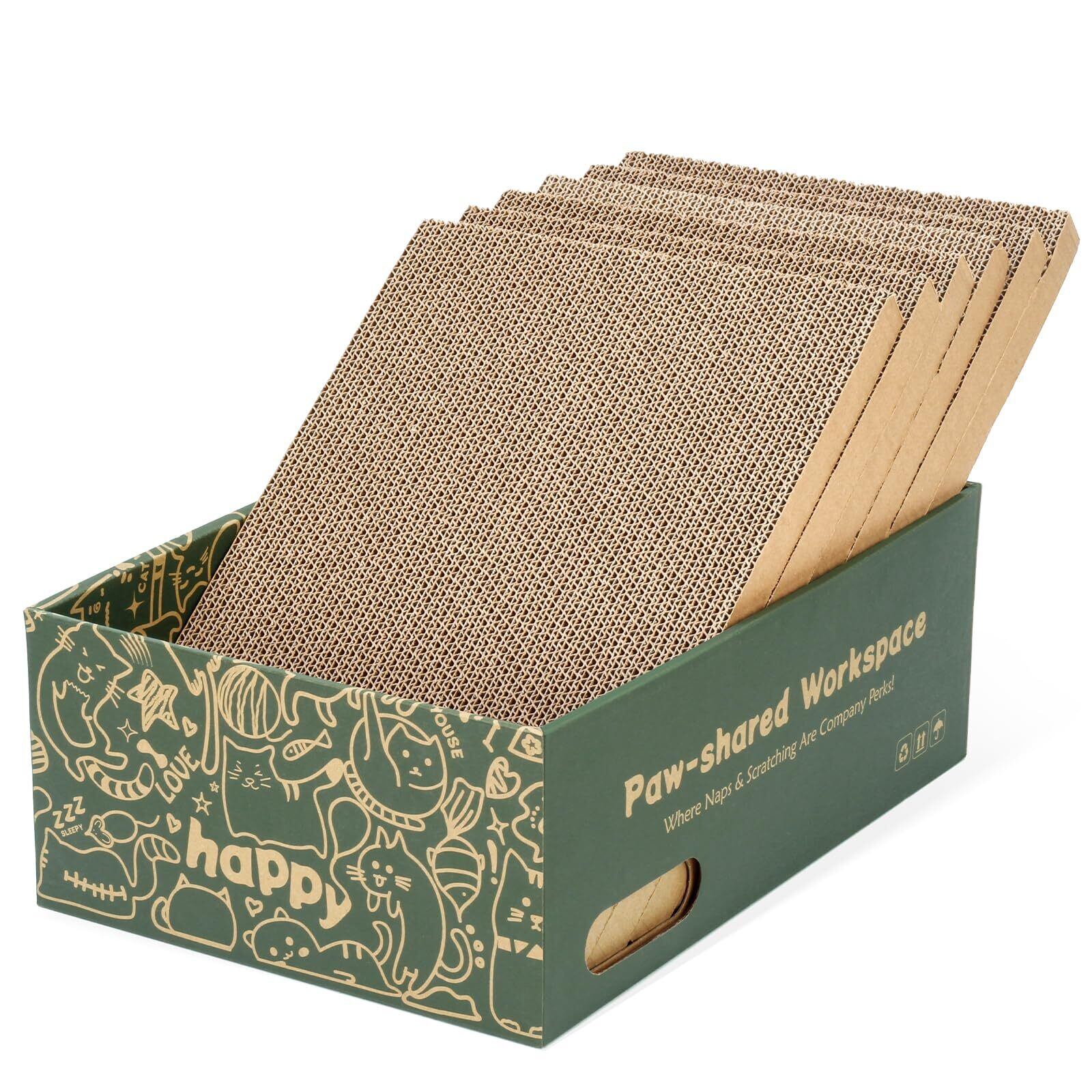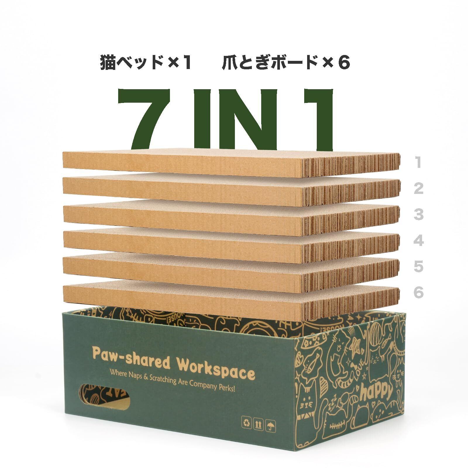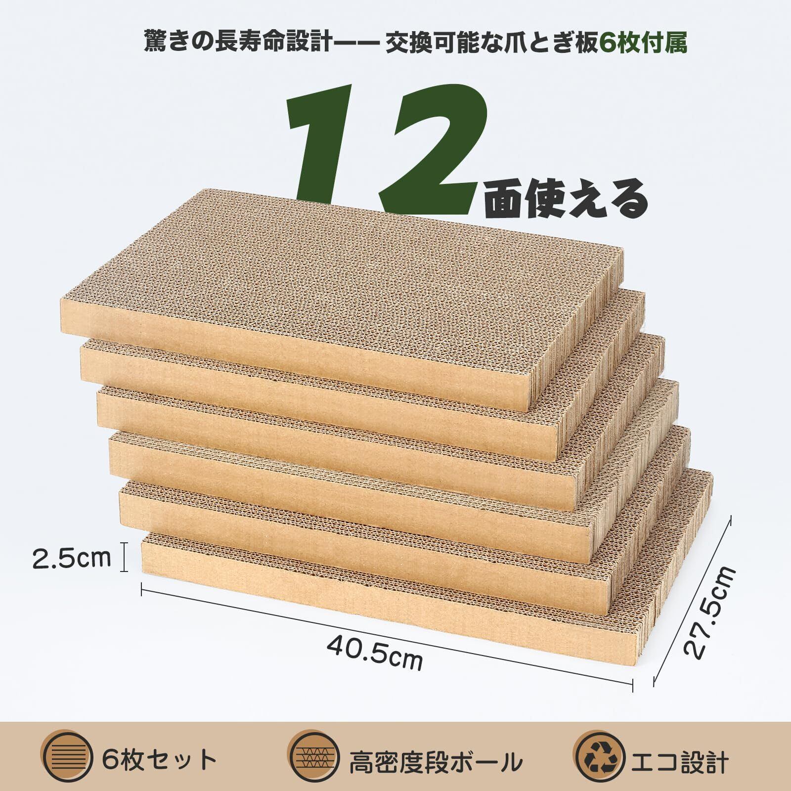 おしゃれなBOXに爪とぎが入っています。爪とぎ板は最大6枚まで重ねて使用可能で、好みの高さや硬さに調整できるのもポイント。6枚入りで合計12面使えるのでコスパ抜群で経済的。爪とぎサイズ:40.5×27.5×2.5cm