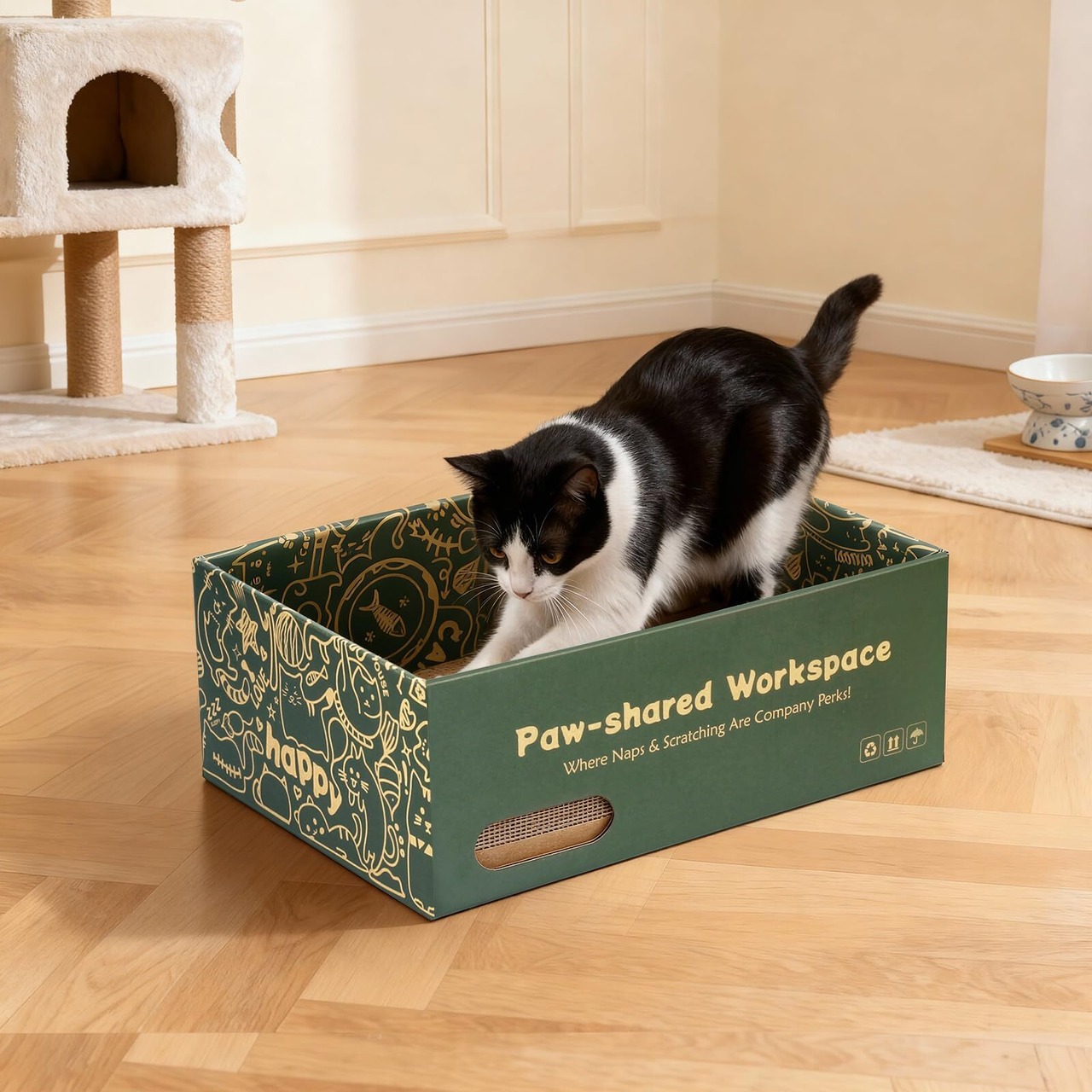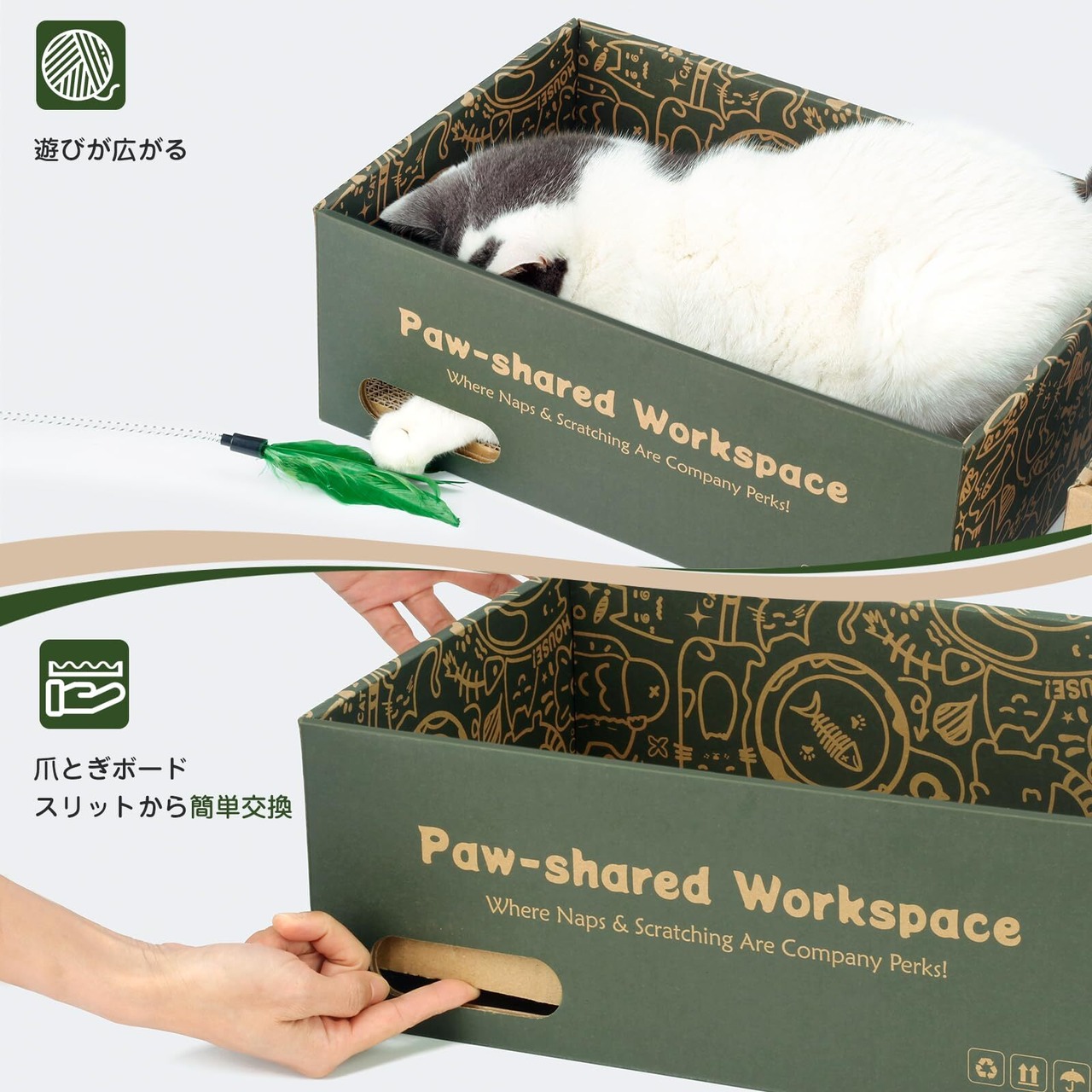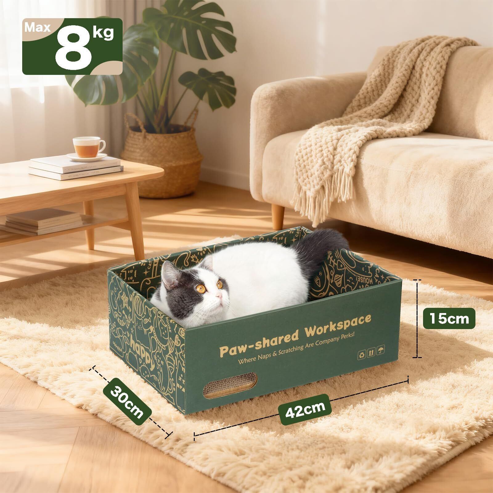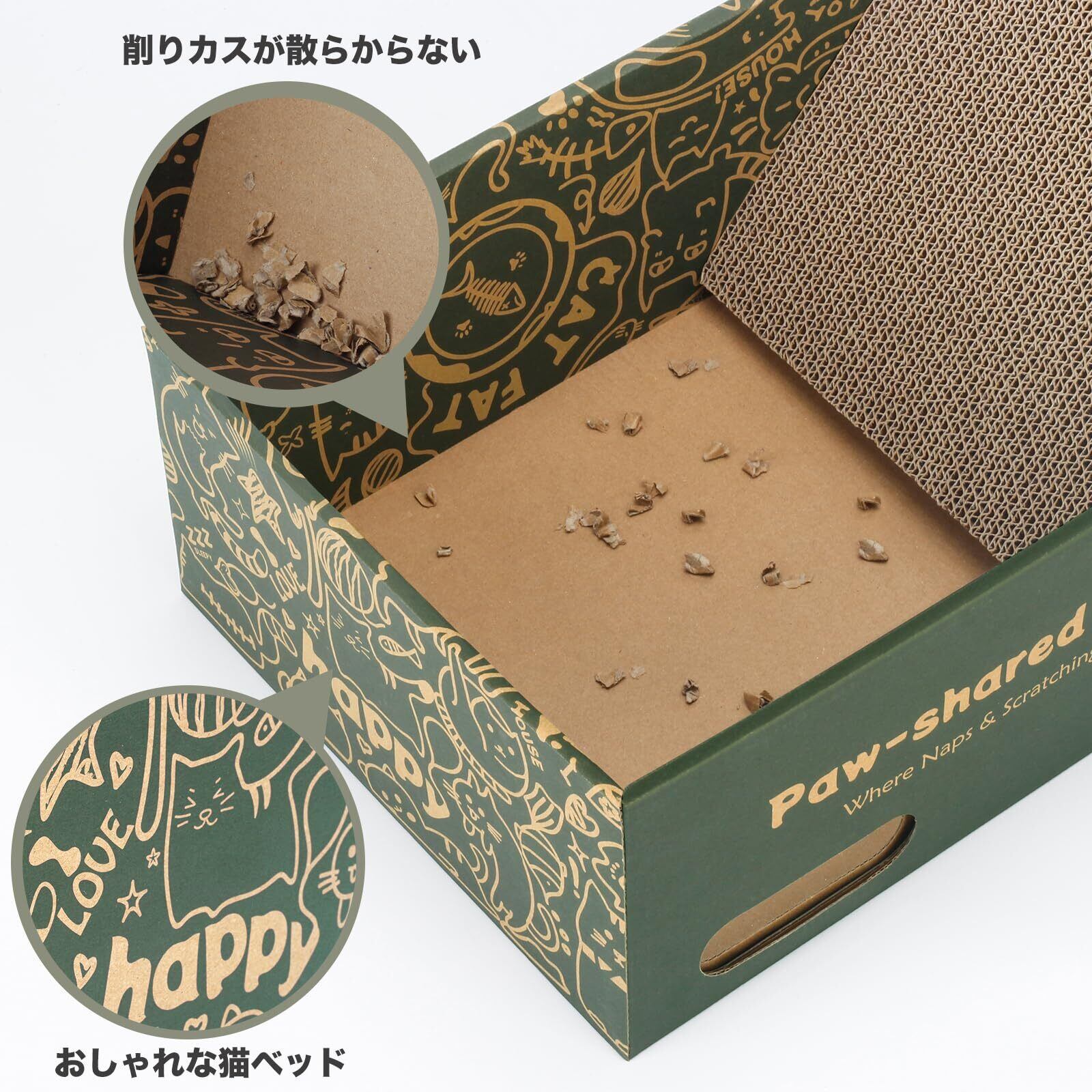 安全性に配慮した100%原紙を使用。愛猫にも地球にも優しい仕様です。高密度に強化された段ボールは一般的なものより約2倍の強度を誇り、2.5cmの厚みでしっかりとした爪ざわり。表裏が使えるので、さらに長くご愛用いただけます