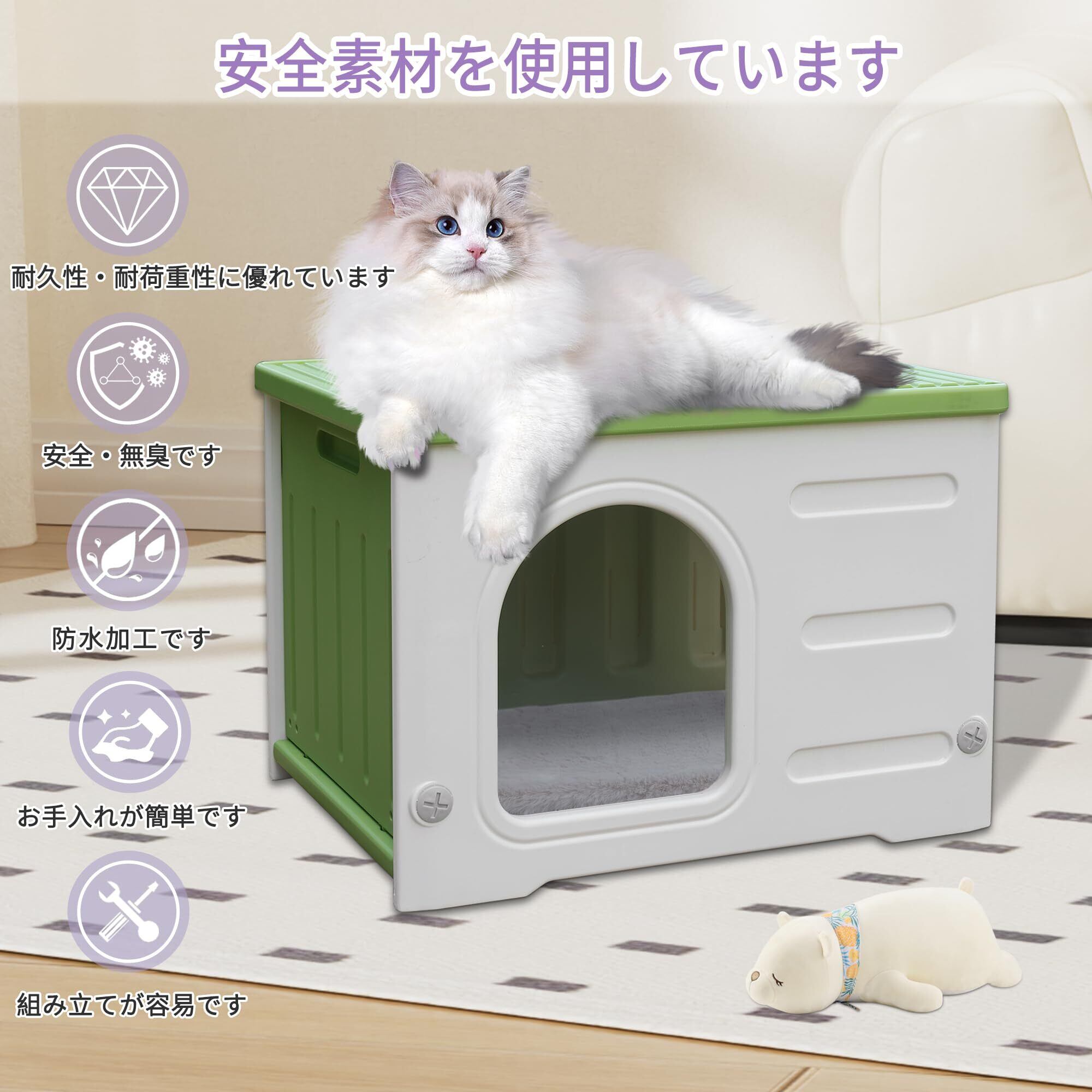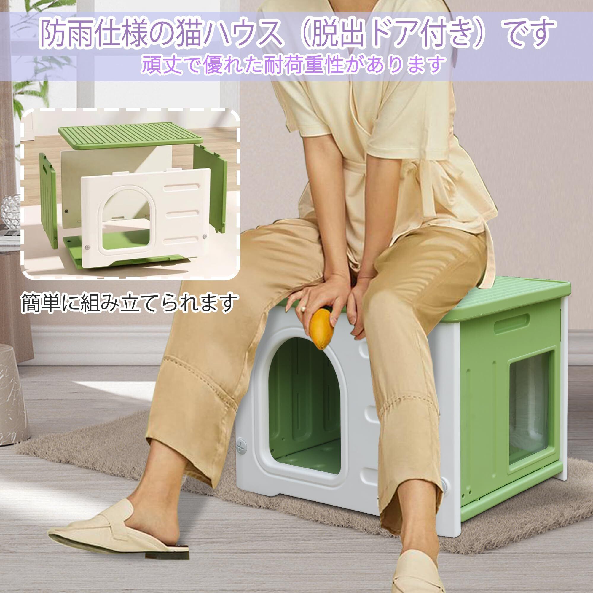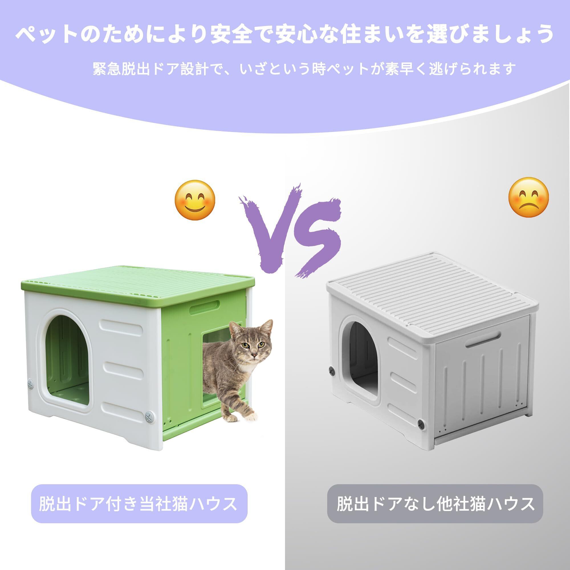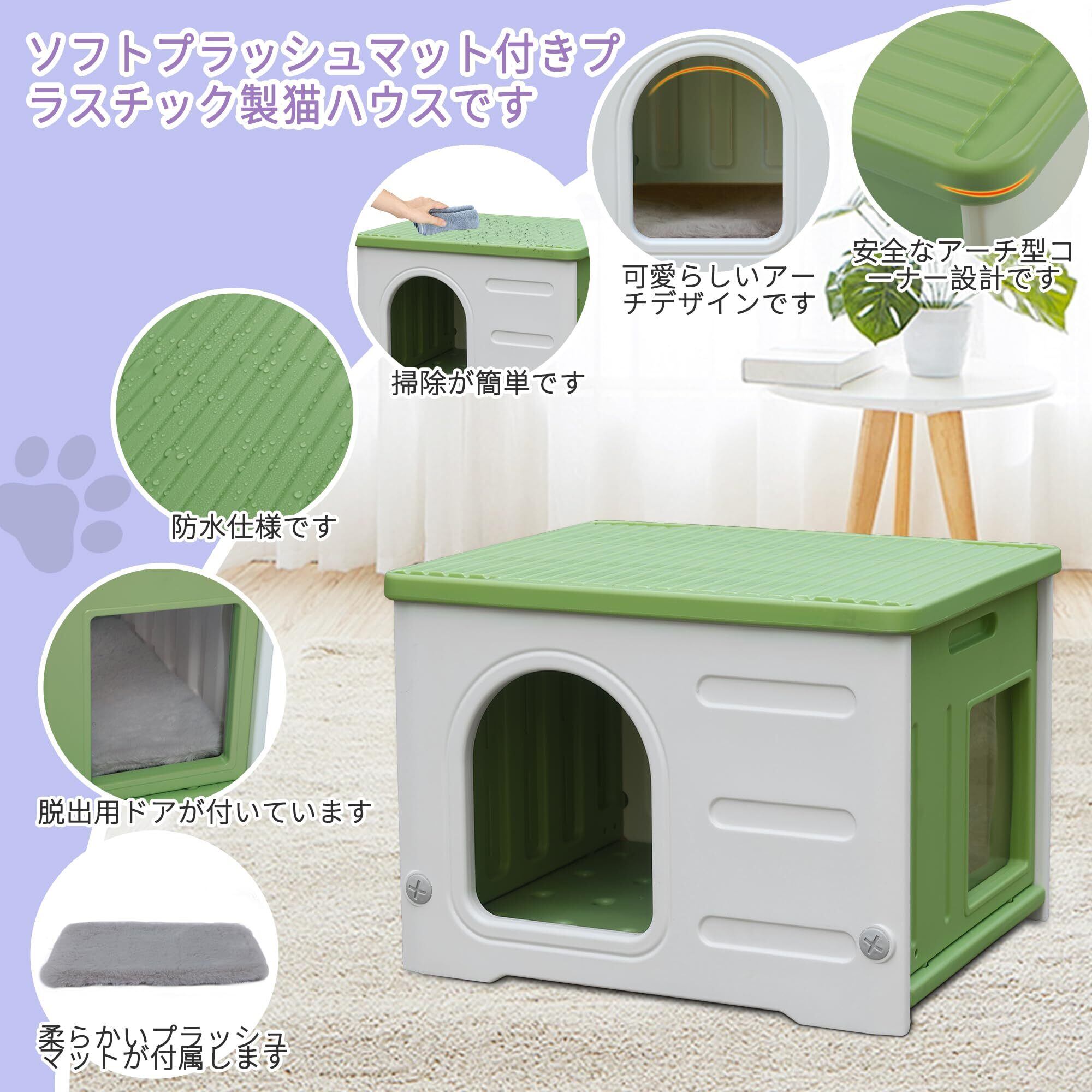 防水 屋外用 猫ハウス プラスチック製 野良猫用 脱出ドア付き ソフトクッション付属 大型サイズ 多頭飼い対応 グリーン