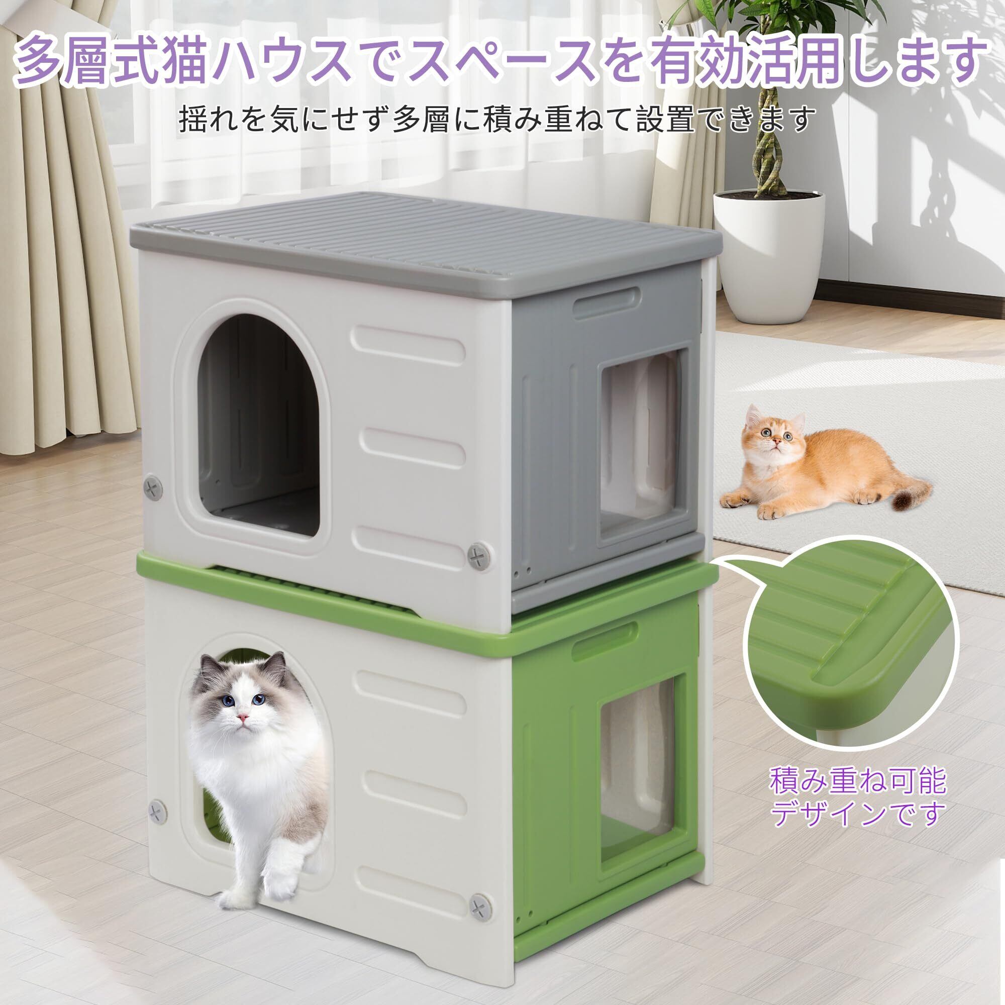 積み重ね可能なデザイン:ハウスを2階建ての猫用ハウスとして積み重ねることができ、スペースを節約できます。多頭飼いの家庭に最適です。積み重ね可能なデザインは実用性だけでなく、猫ハウスの楽しさを増し、猫がより多くの探検や遊びを楽しむことができます