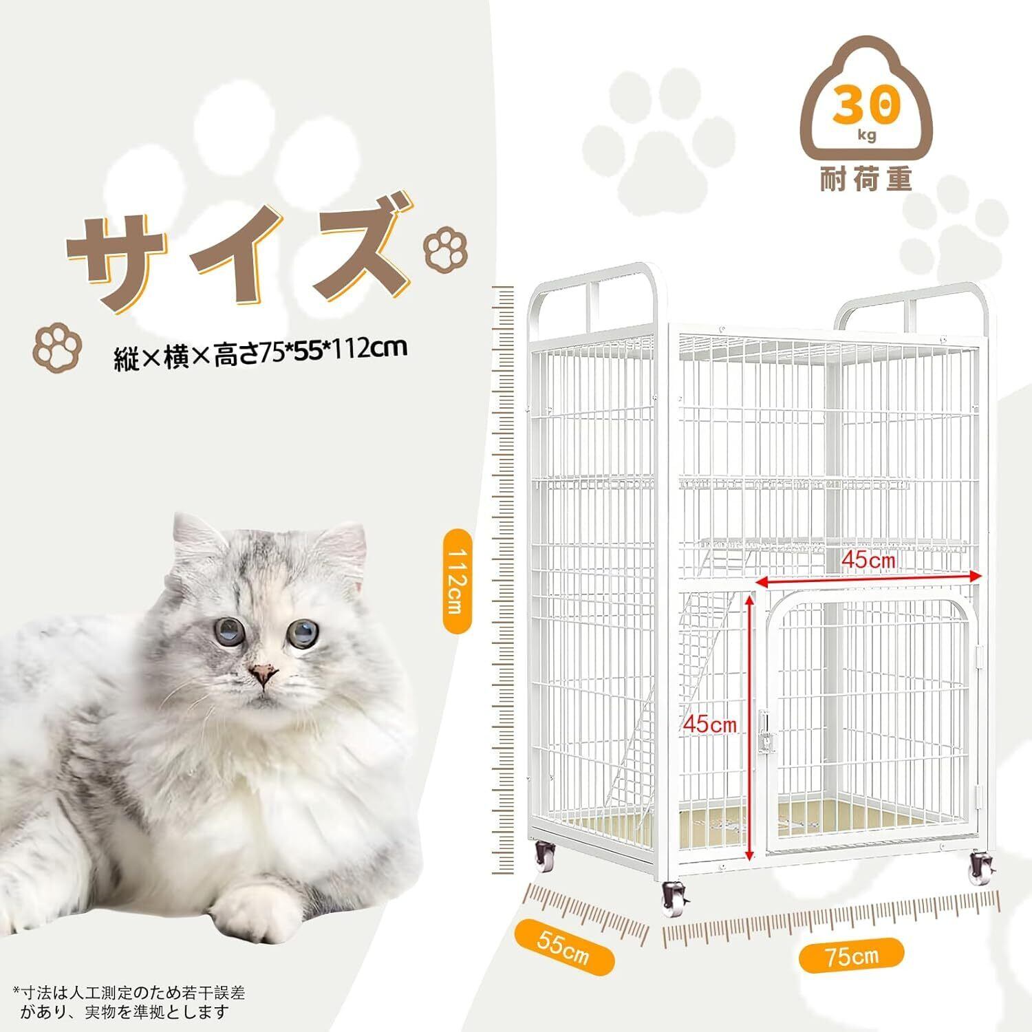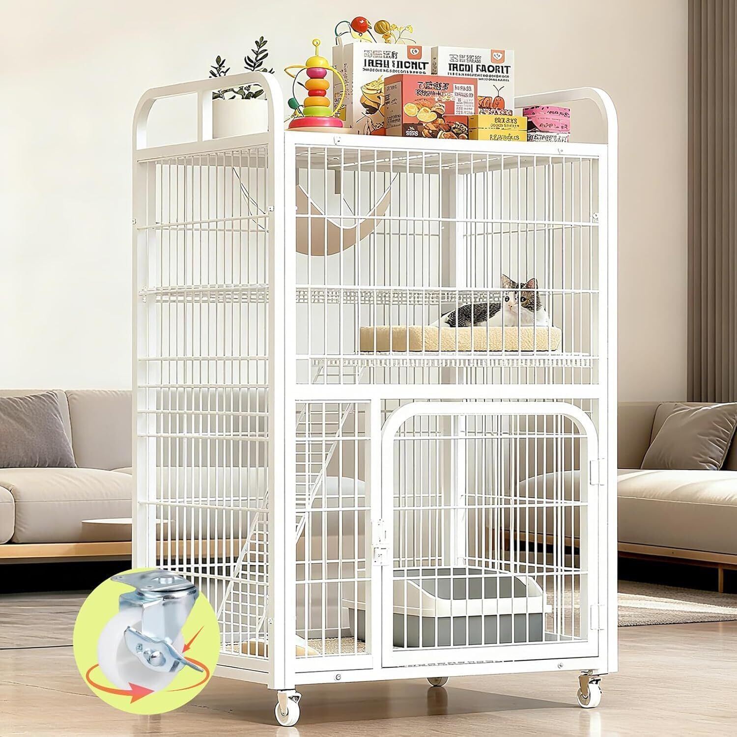 猫 ケージ 多段式 2段 キャットケージ ストッパー搭載 キャスター付き 大型 猫ハウス 組立簡単 移動便利 強くて安定している 留守番 保護 脱走防止 快適な換気 室内用 多頭飼い対応 お手入れ簡単 クッション付 日本語説明書付き (ホワイト)
