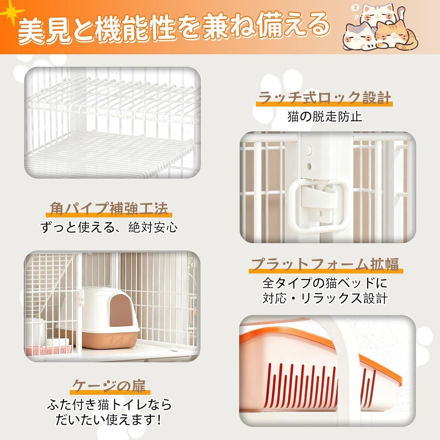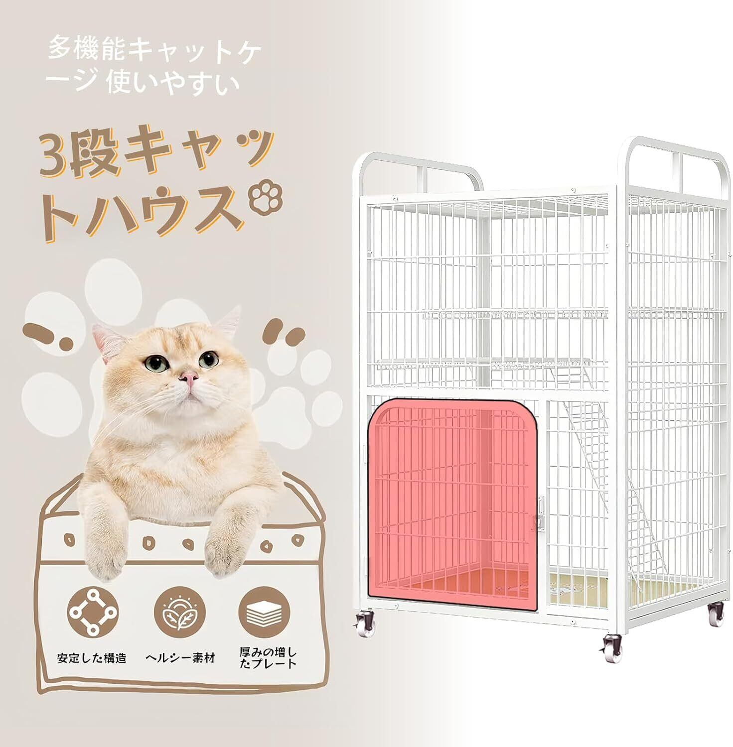 この高品質なキャットケージは、活発な猫の安全と快適さを徹底的に追求した設計。多頭飼いにも最適な広々スペースと強化構造で、愛猫たちの安心できる居場所を提供します。