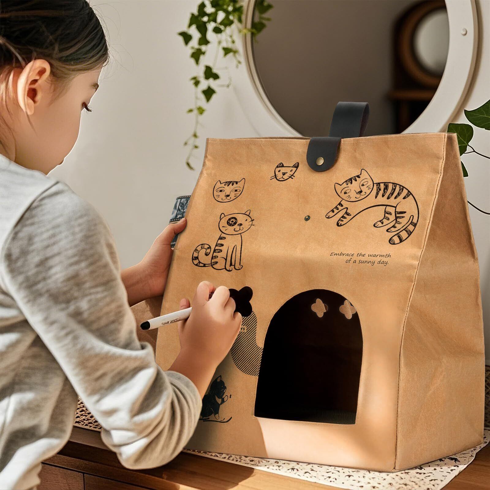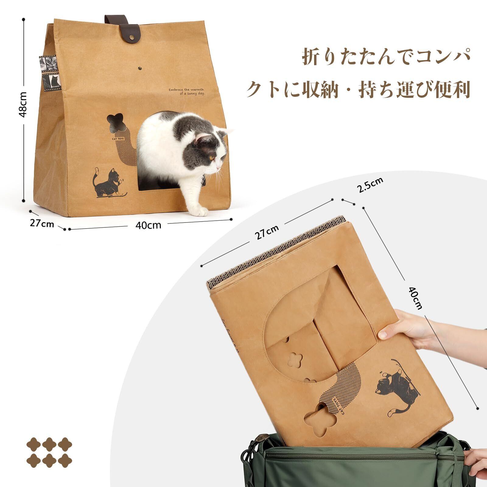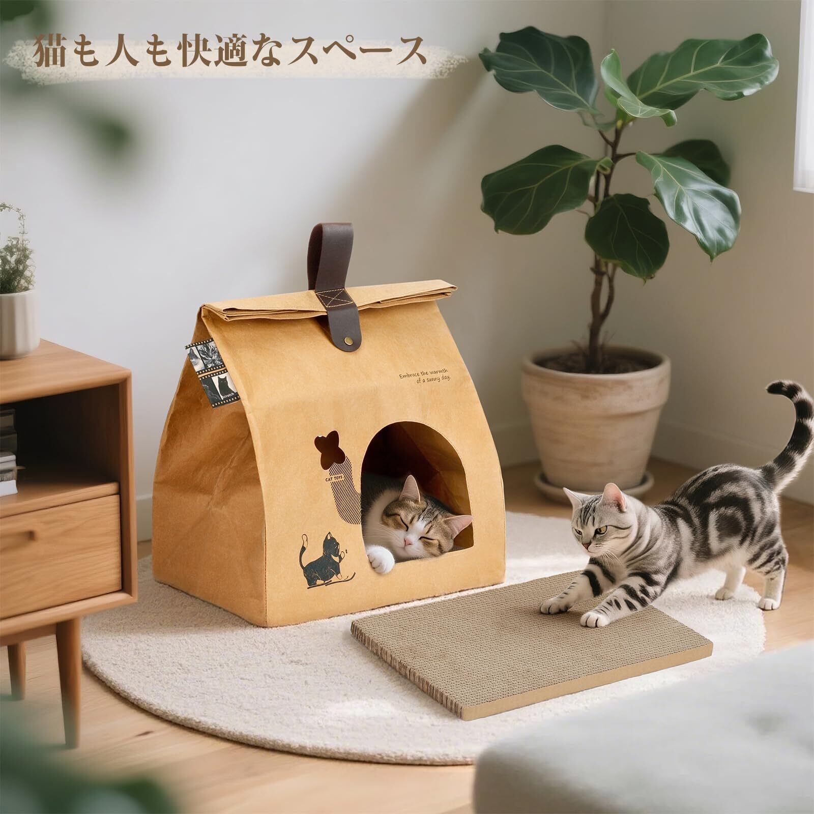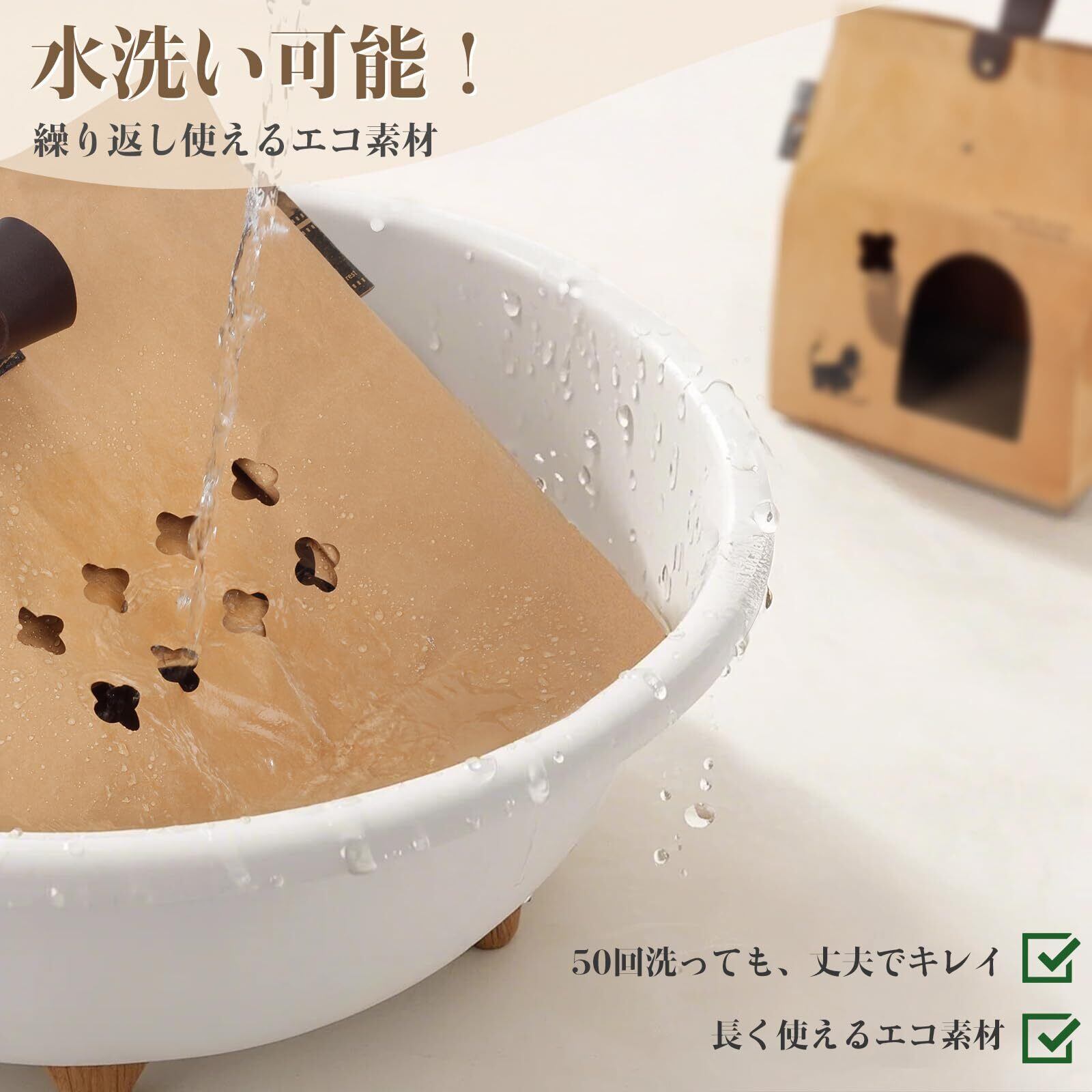 【洗えてエコな高品質素材】特殊加工を施した高級クラフトを使用し、水洗いが可能な猫ハウスです。通常の猫ベッドと異なり、丸洗いできるので、清潔さを長期間保てます。環境に優しい生分解性素材を使用しており、廃棄時も地球に負担をかけません。