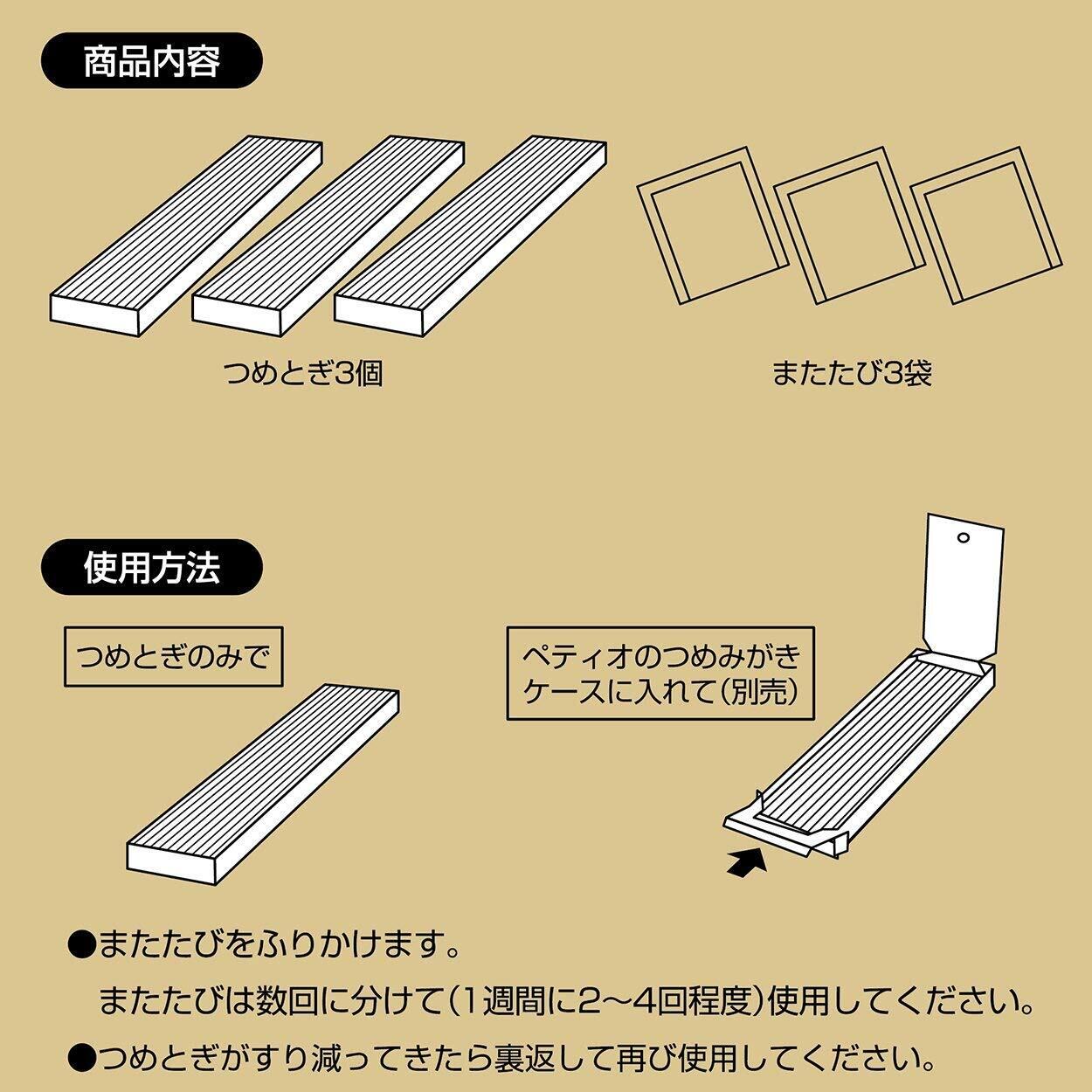 <使用方法>1つめとぎのみで2ペティオのつめみがきケースに入れて(別売)●またたびをふりかけます。またたびは数回に分けて(1週間に2~4回程度)使用してください。●つめとぎがすり減ってきたら裏返して再び使用してください。