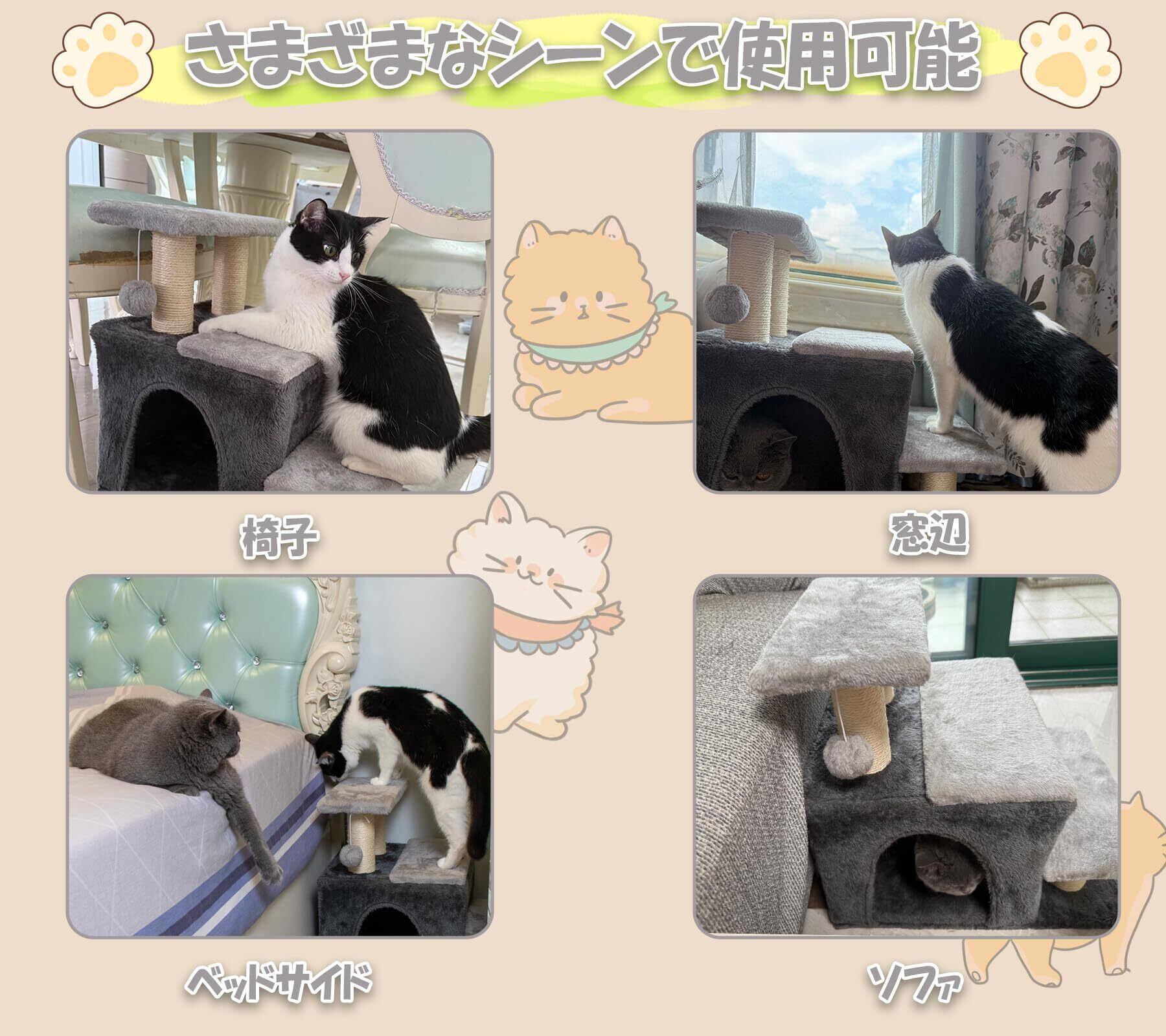 【3WAY多機能デザイン】階段・爪研ぎ柱・ハウスが一体型!高齢猫のベッドステップ/子猫の遊び場/小型犬の休憩所として活用可能。4本の爪研ぎ柱付きで家具保護にも貢献します。