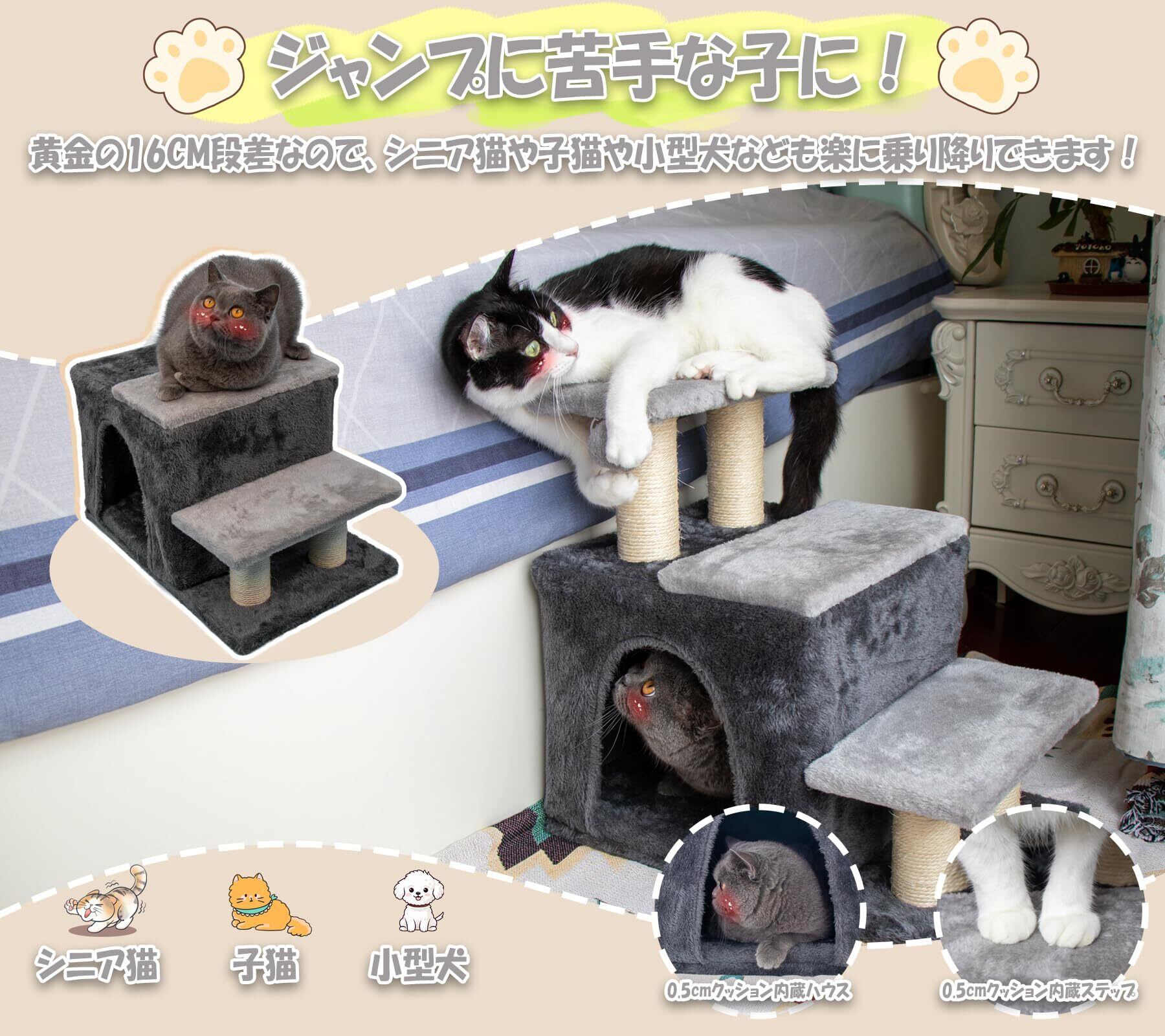 【シニアペットに優しいデザイン】段差16cmの低ステップ&全面クッション加工。関節負担を軽減し、足腰の弱ったペットも自主移動をサポート。猫ハウス内蔵の綿パッドが脊椎を保護します。