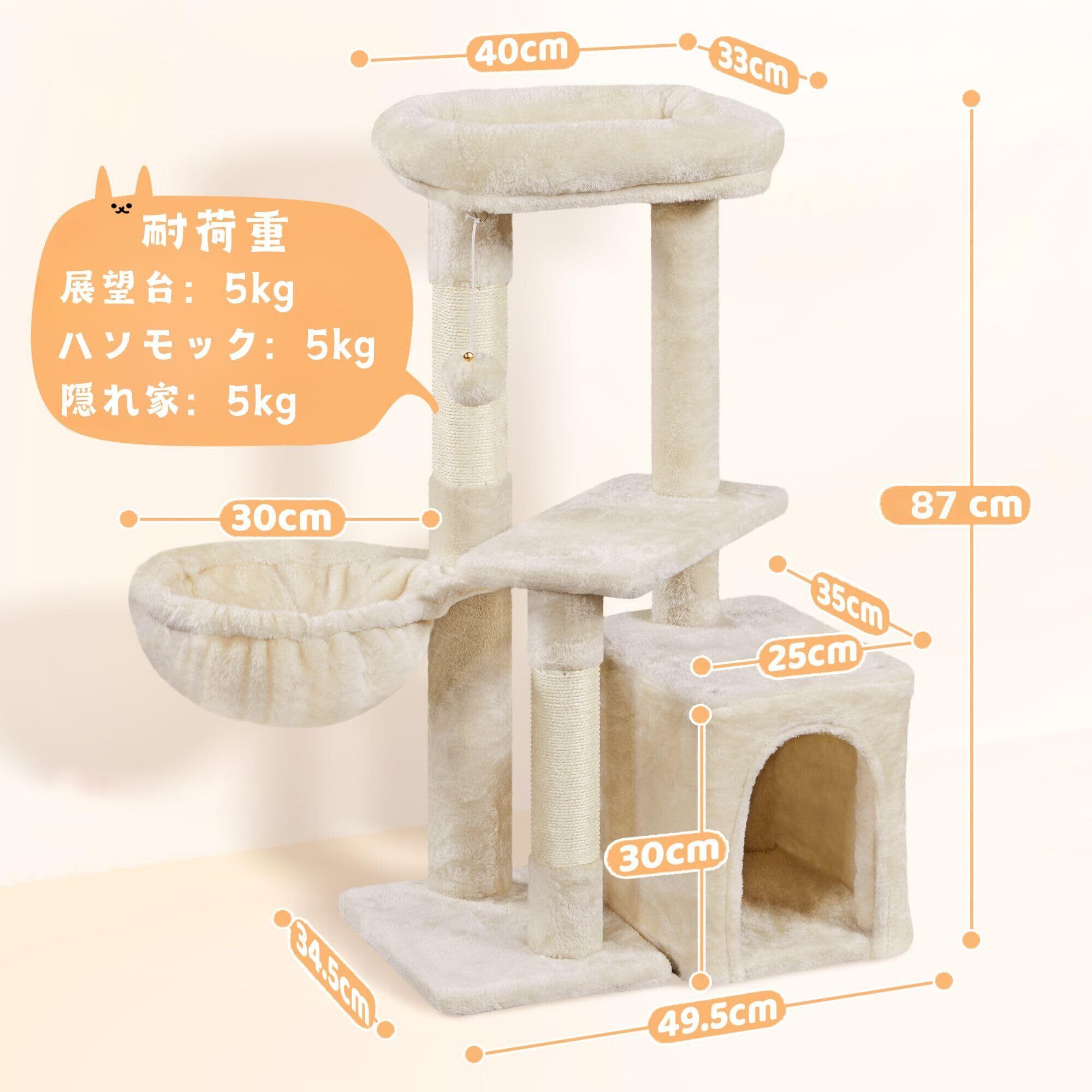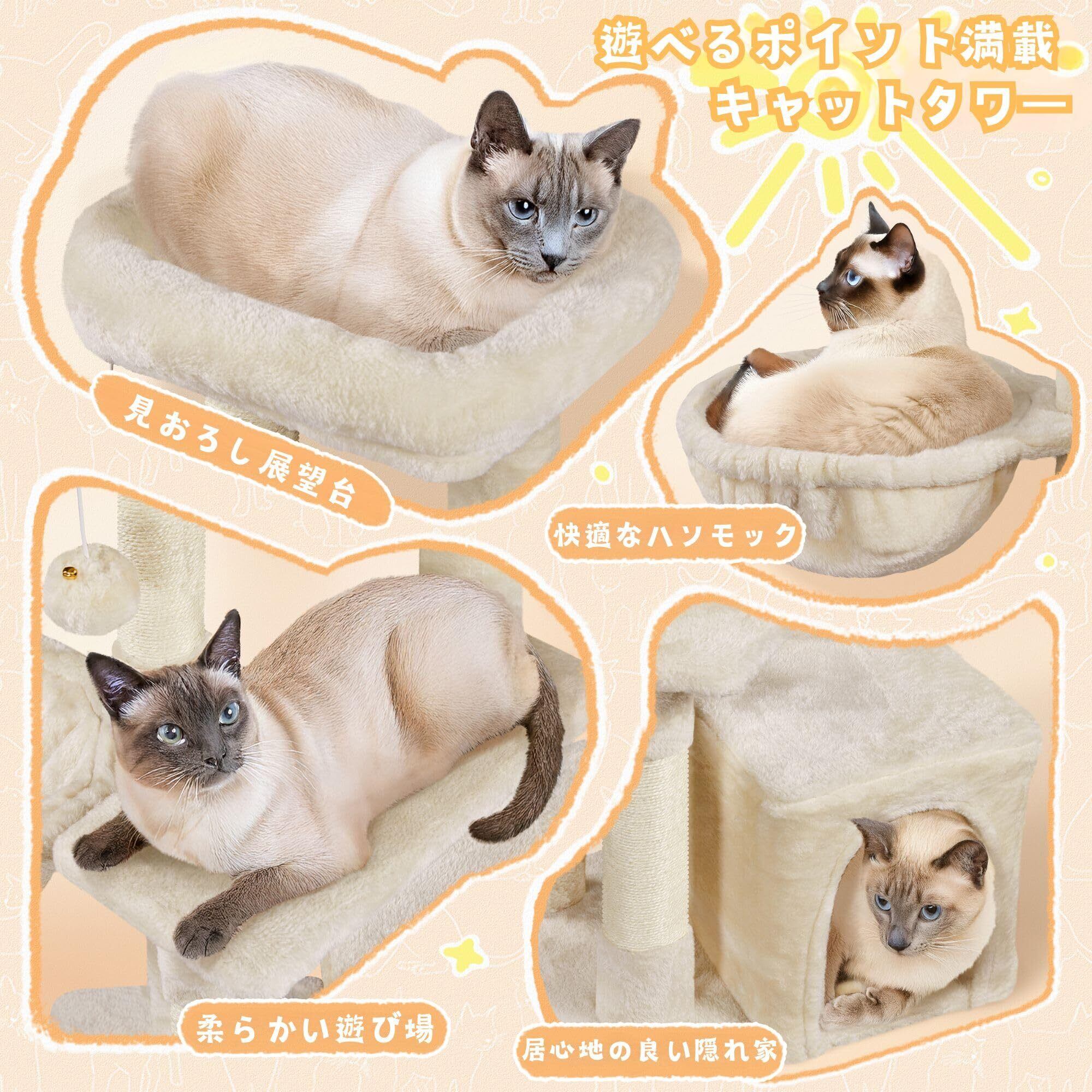 Yaheetech キャットタワー 高さ87cm 大型 中型 シニア猫 子猫 多頭飼い 猫タワー 据え置き 爪とぎポール 広いハウス ハンモック おもちゃ付き 爪研ぎ 猫ハウス 登りやすい 天然サイザル 転倒防止 (ベージュ)