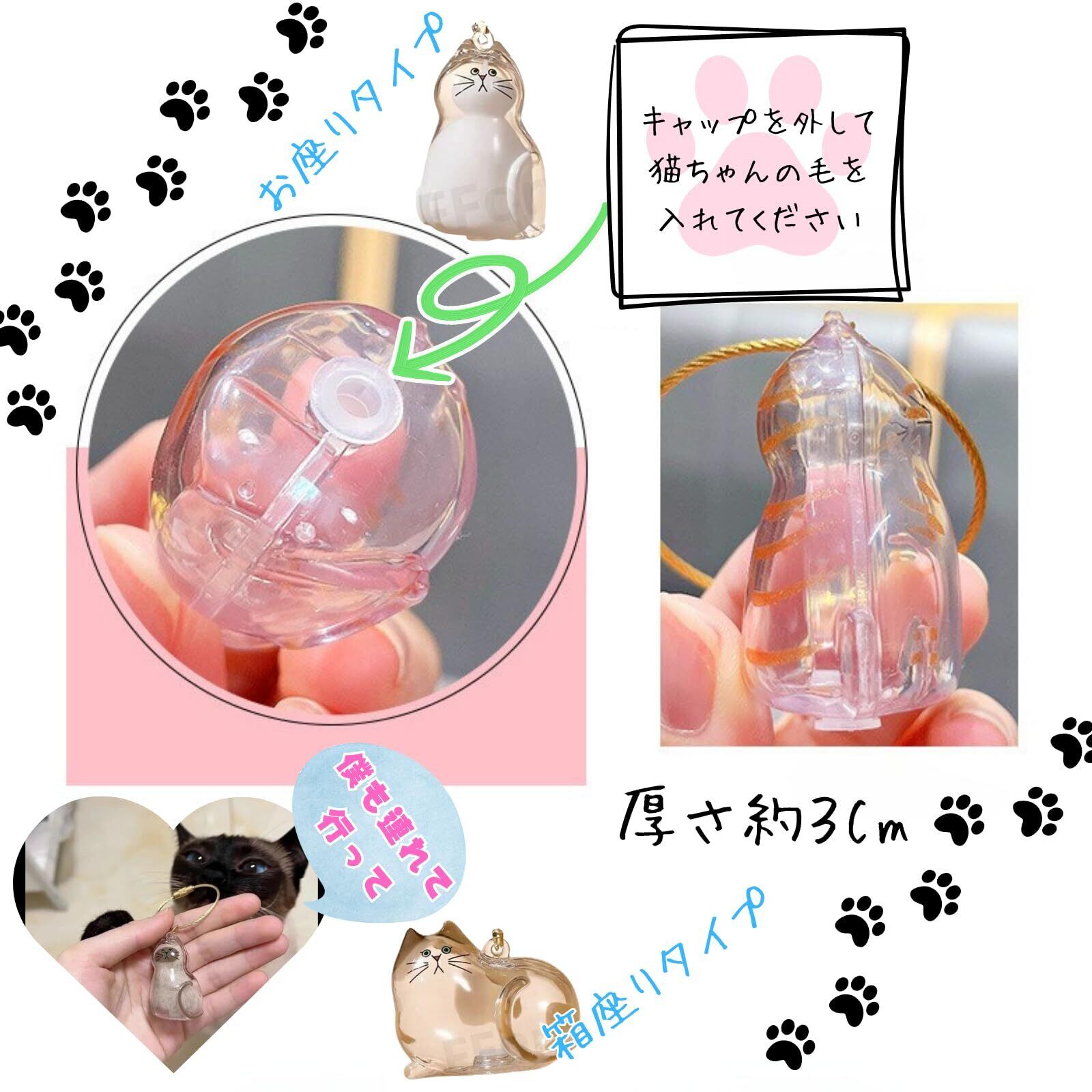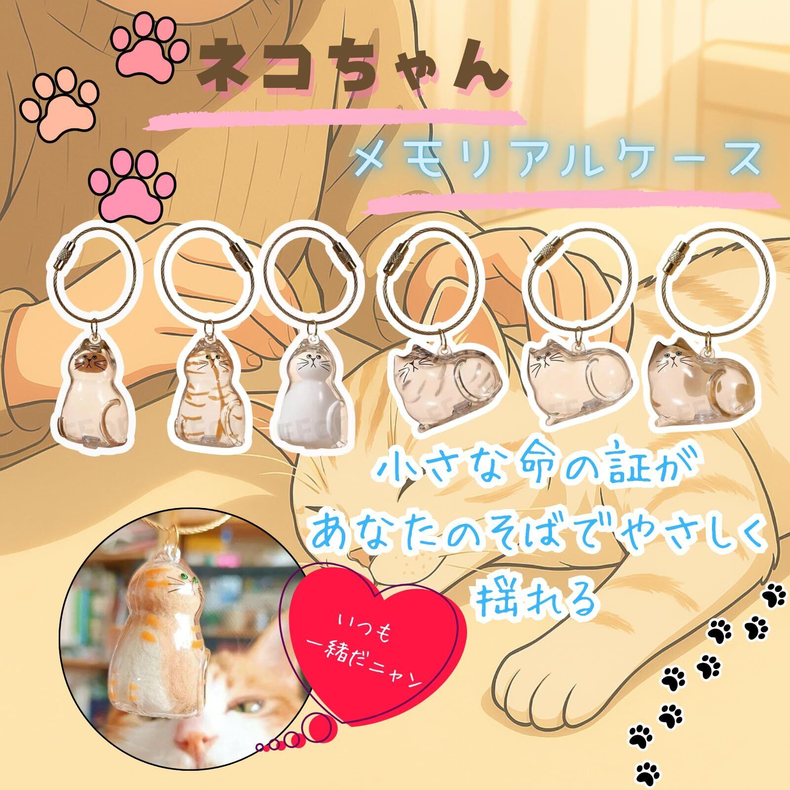 注意※ワイヤーリングはランダムカラーとなります。ご了承ください。大切な猫ちゃんの毛やひげを、そっと収めて持ち歩ける小さなメモリアルボトル。丸まる姿やしゃがむ猫のシルエットをモチーフにしたデザインは、猫好きの心をくすぐります。バッグや鍵に取りつけやすいコンパクトサイズ(約3×5cm)で、いつでもどこでも「一緒にいたい」気持ちに寄り添います。丈夫なプラスチック製ボトルに、金属製のキーリングを組み合わせて長く使える安心感も◎。