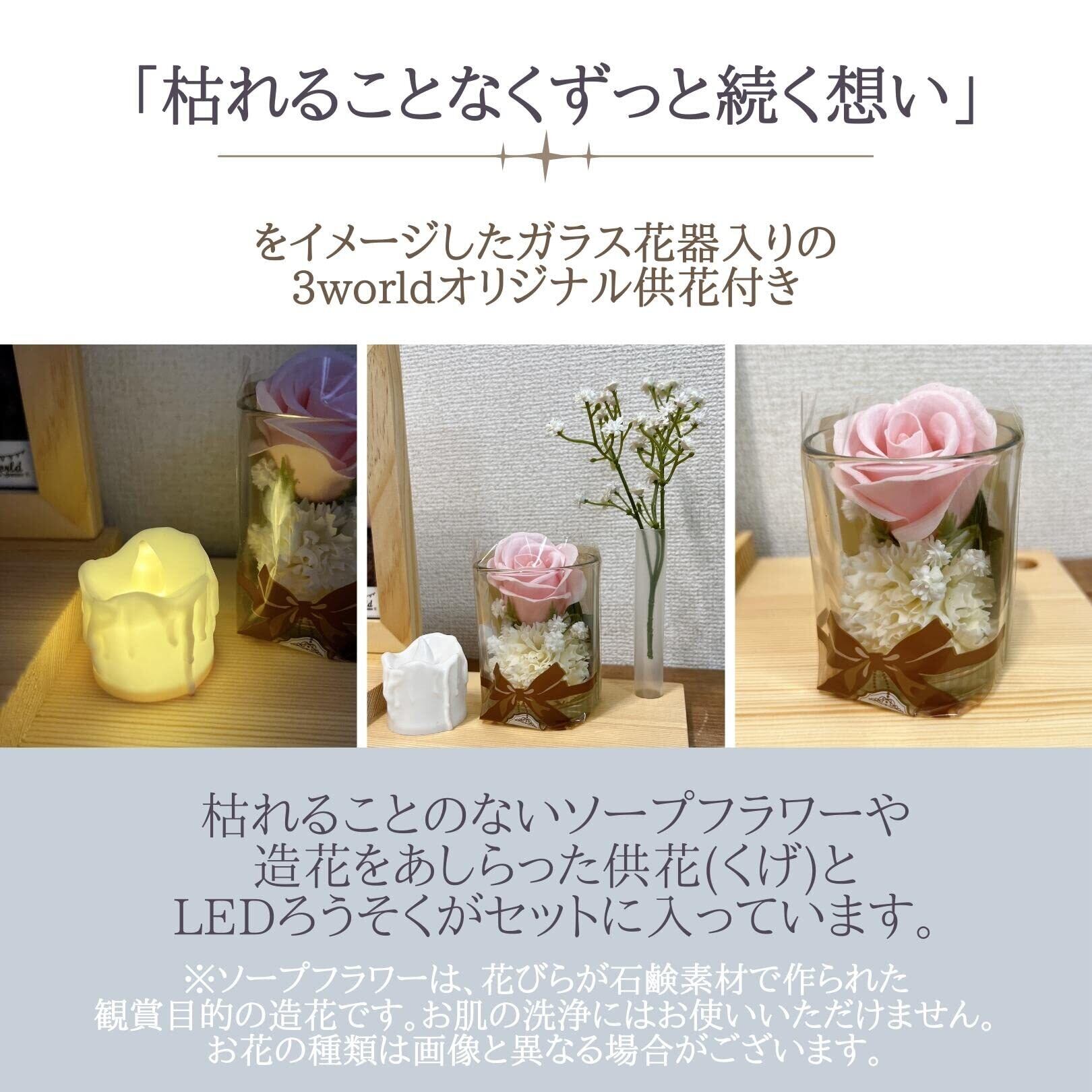 「枯れることなくずっと続く想い」をイメージしたガラス花器入りの3worldオリジナル供花と、LEDろうそくもセットにしました。