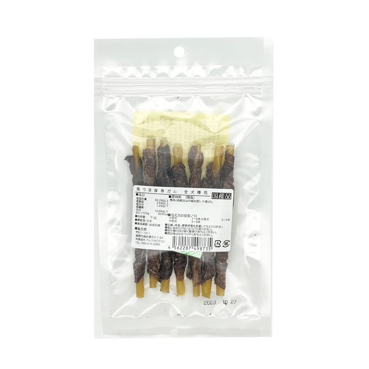 厳選素材を使った「こだわり」商品です。わんちゃんの健康を第一に考え、素材感を重視し、ひとつひとつ丁寧に手作業で作りました。安心安全の国産無添加。【原材料】馬肉(西欧又は中南米産)、牛皮ガム【成分値】粗たん白質82.2%以上、粗脂肪3.9%以上、粗灰分1.2%以下、粗繊維-、水分12.6%以下、カロリー:100gあたり 約364kcal