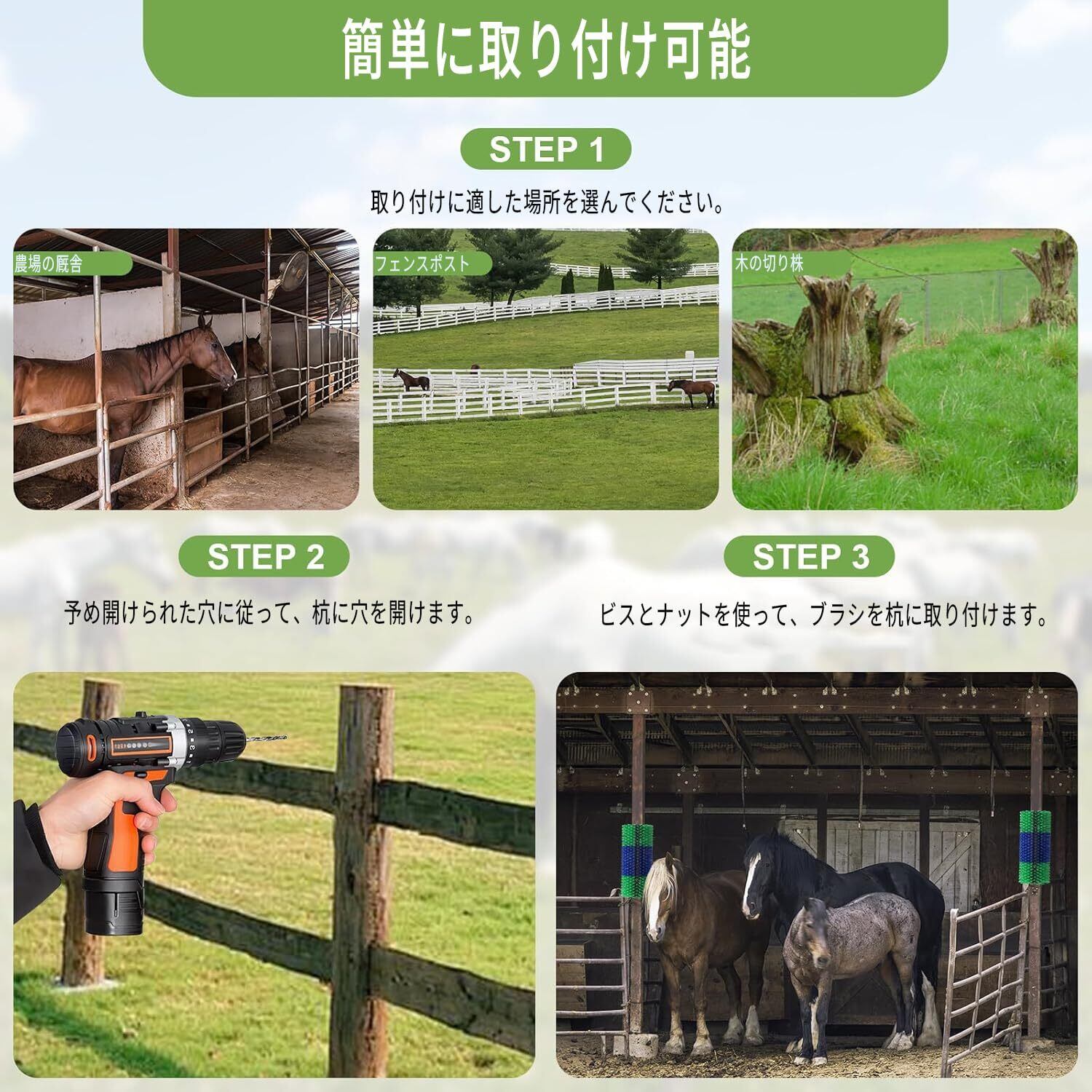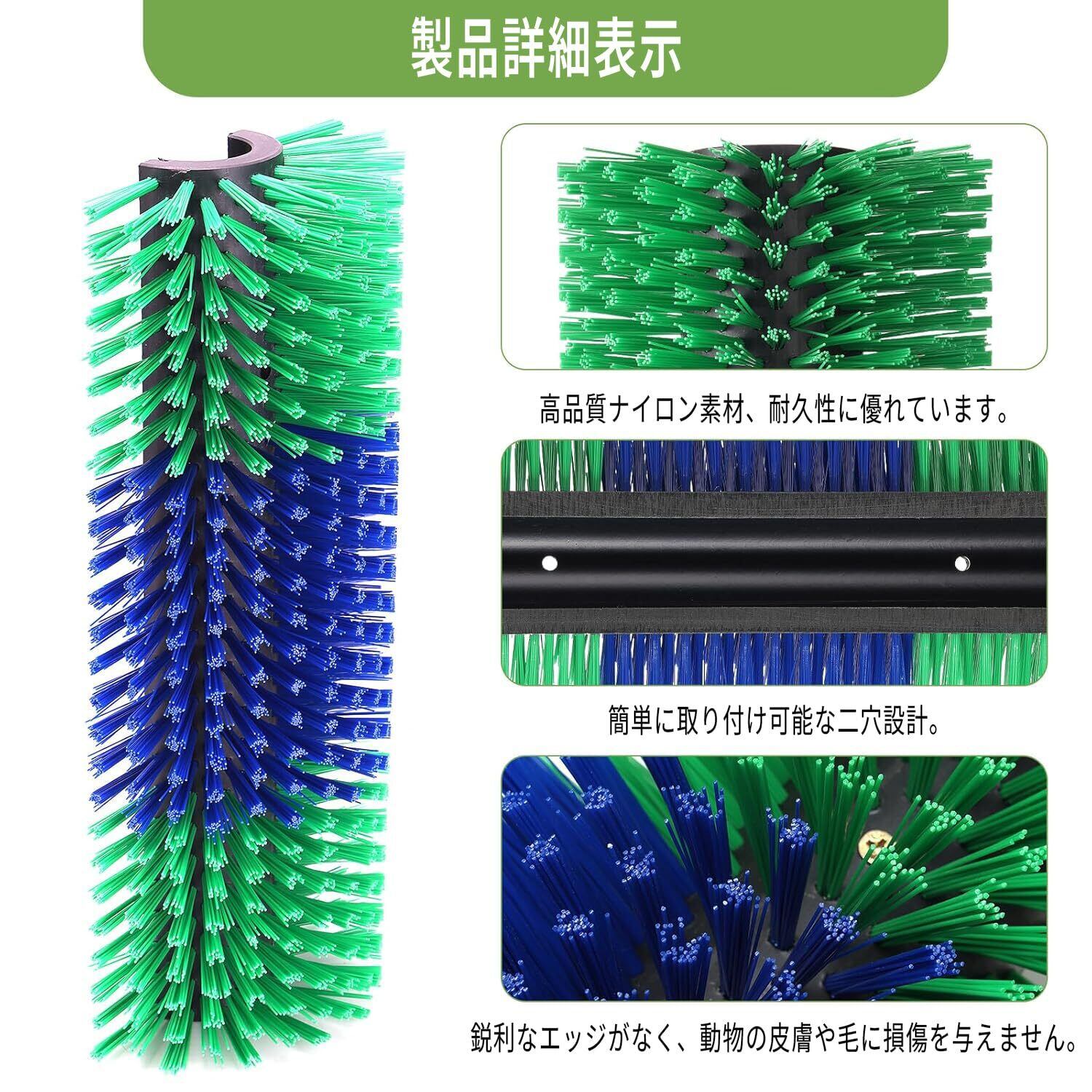 家畜のブラシ 2本セット|スクラッチ&背中マッサージブラシ 馬・牛・羊用 耐久性ある柔軟素材 屋内外兼用・ねじ付属(必要時に固定可) グリーン