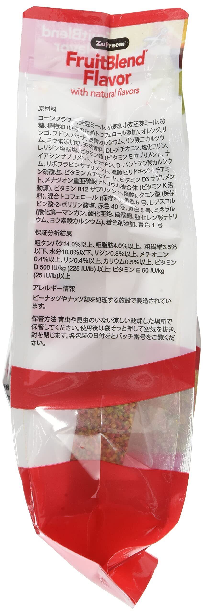 天然フルーツを練り込んだインコ専用ペレットです。フルーツの形をした独特なペレットはインコの興味をそそり、バナナ、オレンジ、アップル、グレープのフルーツの香りは食欲を増進させます。 主食とし使用でき、サプリメントを必要としません。フルーツブレンドは着色料を使用しておりますが、糞と共に排出されますので安心してご使用いただけます。※人工防腐剤・保存料不使用 賞味期限の印字が見にくいものは賞味期限シールを貼っています。