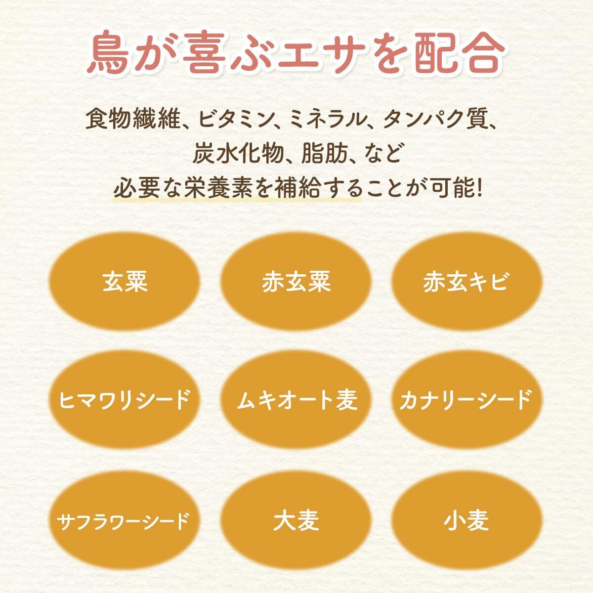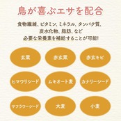 原材料:玄粟、赤玄粟、赤玄キビ、ヒマワリシード、ムキオート麦、カナリーシード、サフラワーシード、大麦、小麦
