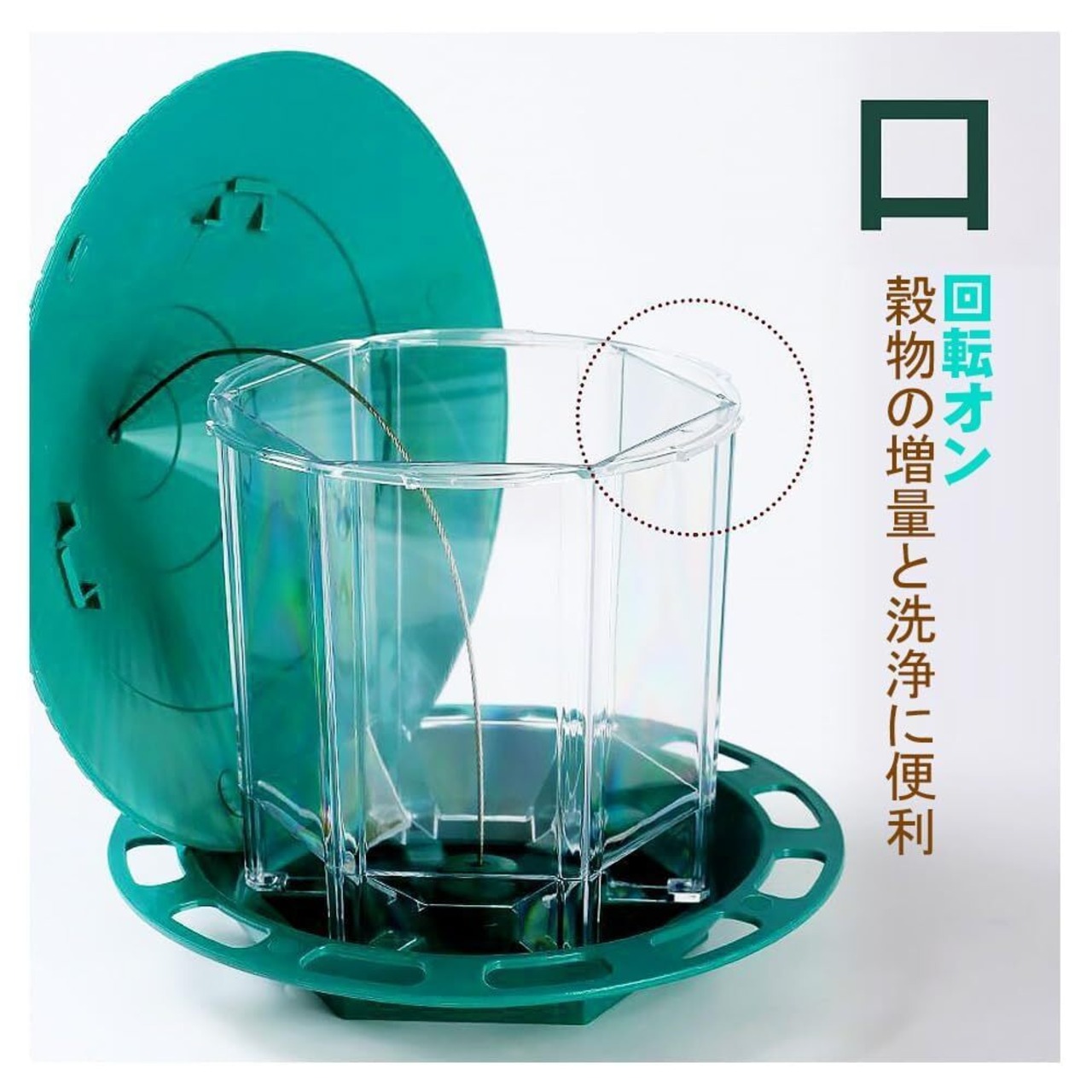 【大容量】最大約1kgのエサをたっぷり入れることができ、頻繁に補充する必要がありません。鳥に食べられると、餌がプラスチックの下部の半円状の穴から落ち、自動的に新しい餌が供給されます。雨の日に種子が浸るのを防ぎ、種子を常に乾いた状態に保つために、底板に水抜き穴を5か所開けます。蓋を開けて、野鳥の種、鳥用のひまわり種を鳥の餌箱に入れ、蓋を閉じて、ひさしの下や庭に吊るします。